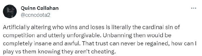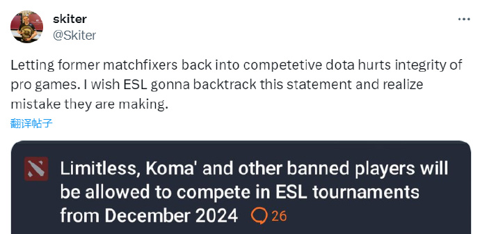 这则消息一出,许多现役的Dota2选手都表达了反对意见,首当其冲的就是skiter和Quinn。Skiter坦言:“让以前违规的人回归竞争激烈的Dota有损职业比赛的诚信。我希望ESL能收回这句话,并认识到他们正在犯的错误。”
