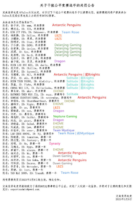 2022年12月,刀圈发生了一起重磅事件。由于在赛事期间共享账号和冒充其他队伍成员,包括Paradise’、Keintseru、SuperNova、Illusion、Lilskrip、Koma`、Chambl、Limtless、SA、deihra在内的选手,遭到V社官方和PGL永久禁赛。