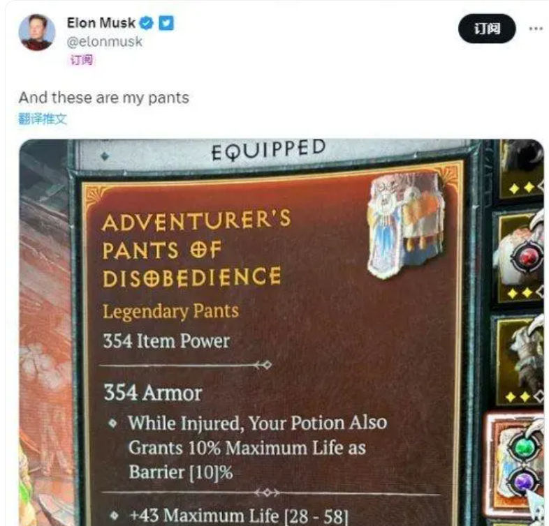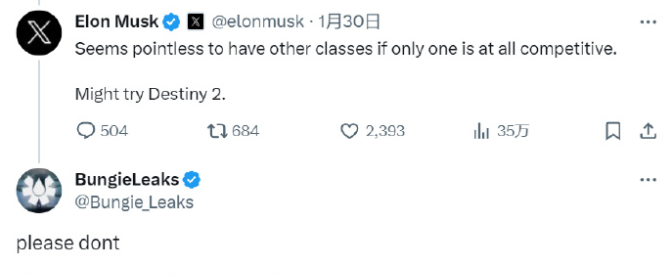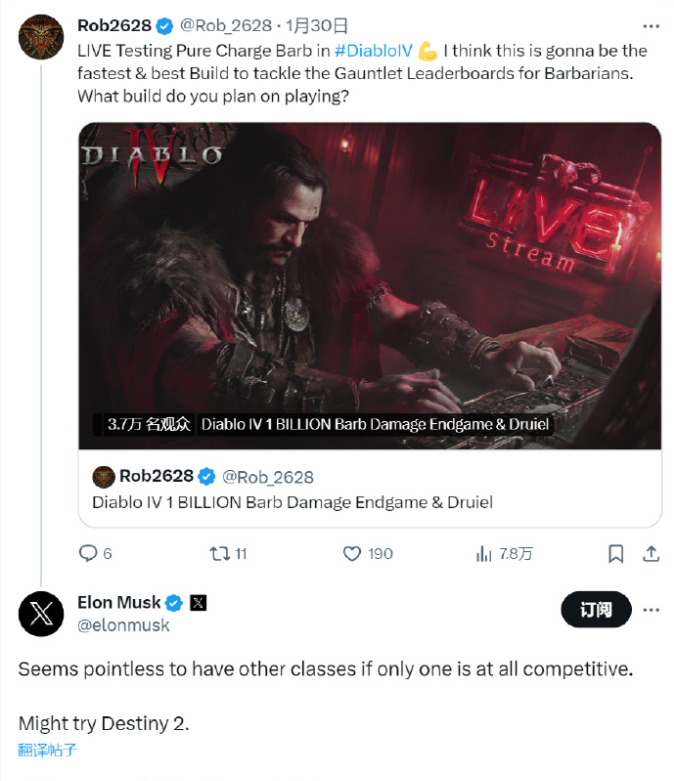 同时,马斯克也是明确表示如果暴雪设计师在短时间内无法解决《暗黑4》的职业平衡问题,那么他就会彻底退坑跑去玩《命运2》,因为没有一个正常玩家想要被设计师教着玩游戏。但他这番言论没等来《暗黑4》玩家的一致点赞,反倒是给《命运2》玩家吓得够呛,他们纷纷表示希望马斯克别来嚯嚯《命运2》,最起码这款游戏还能玩。