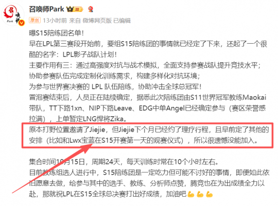 与此同时,召唤师Park还爆出了一则大消息,那就是参加陪练的所有人从10月15日需要封闭式集训24天,每天的训练量在10个小时左右。有很多职业选手例如JieJie是想要去当陪练的,但苦于早就定了其他行程,无法抽出完整的24天时间参与,只得遗憾放弃。