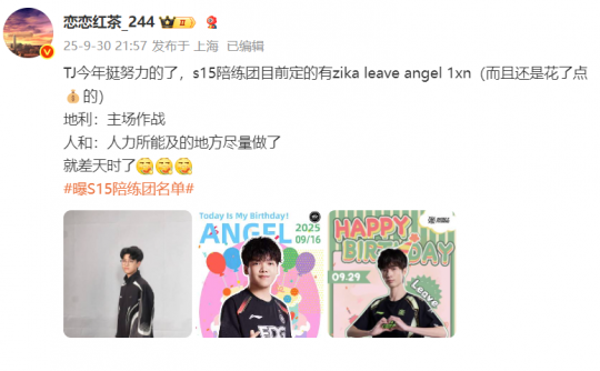 对此,爆料人“恋恋红茶”解释称,因为是休假的关系,LPL联盟与俱乐部方面无权干涉选手的决定,这次陪练团选拔除了看重选手的个人能力外,更是全凭自愿,也不能强求。
