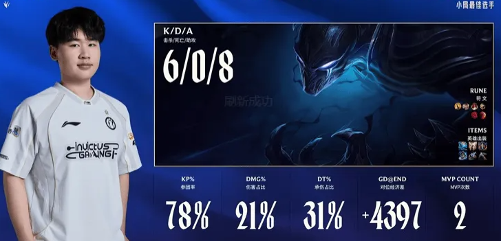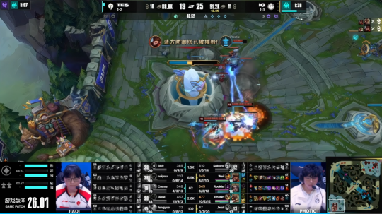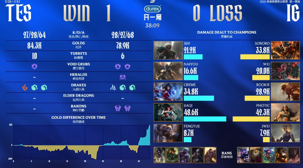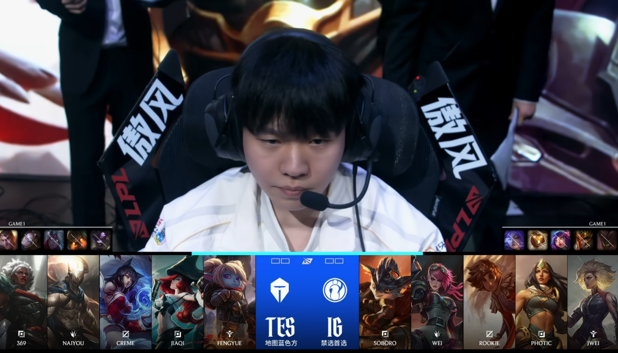 首局比赛,从某种意义上来讲完全是IG送的,在带着大龙BUFF情况下,Wei带头送了关键一波,直接把优势抹平。比较难崩的是,当IG水晶被打爆时,人头数还领先着TES,但凡这局IG失误少个一两次,也不至于输掉比赛。