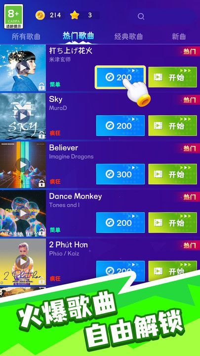 3、超多的歌曲和关卡等待着你的解锁和挑战,十分时尚;
