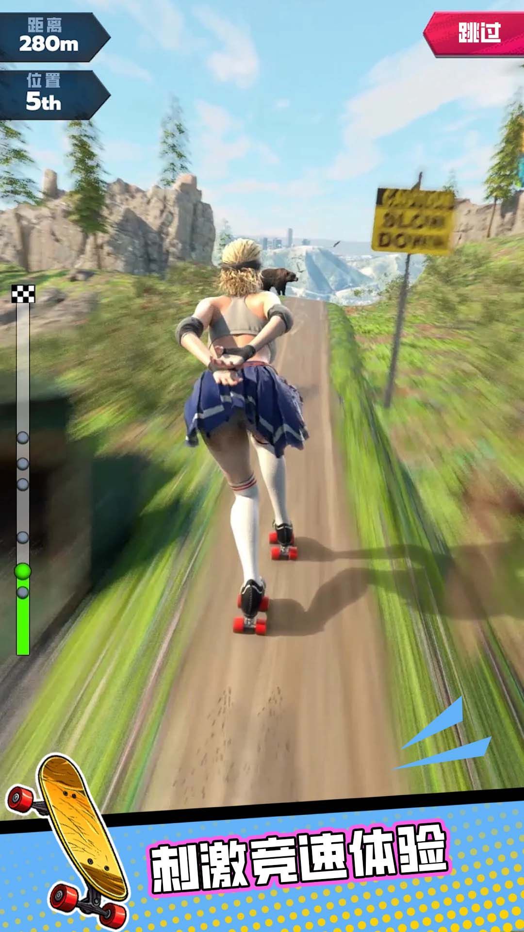 1、踩着滑板冲刺,在不同的赛道当中前行,注意力集中保证安全。