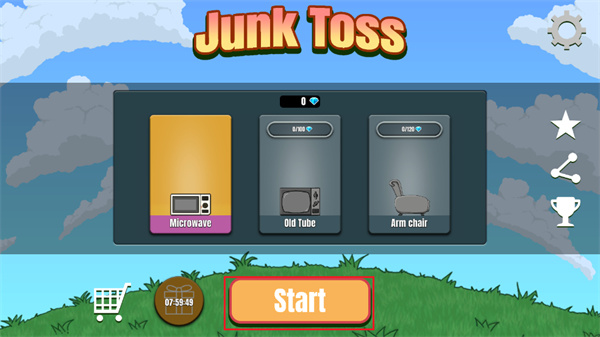 1、进入到游戏的场景内之后,玩家需要点击屏幕之中的【start】按钮,以开启你的废品投掷之旅;