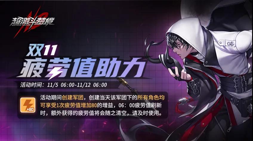 各位英雄好!今天给大家带来了一则劲爆消息!梦境世界即将开启双十一福利活动! 11月5日06:00-11月12日06:00,英雄们在任意服务器创建新军团后,该军团内的新角色即可获得双倍疲劳(额外获得80点疲劳增益),助力英雄们快乐冲级! 注意事项 1.英雄需在活动期间创建军团,创建后该军团内的新角色将立即开始享受1次疲劳值额外增加80点的增益; 2.活动期间,每日06:00疲劳值刷新时,额外获得的疲劳值将会随之清空。 必看!防止错过疲劳值助力! 为了帮助大家更好地打怪冲级,本探特地模拟了英雄们的各种游戏情况,准备了详细的双十一疲劳值助力攻略! 情况1:11月5日11:00,英雄A在某服务器中创建了新的军团【梦境第一军团】,该军团内的所有角色享有额外疲劳助力值的时间为11月5日11:00-11月6日6:00。 情况2:11月7日4:30,英雄B在某服务器中创建了新的军团【梦境最NB的军团】,该军团内的所有角色享有额外疲劳助力值的时间为11月7日4:30-11月7日6:00。(亏大发了,英雄们记得不要这样干) 大力提醒 军团成功创建的时间即为疲劳值助力开启的时间;每日6:00是疲劳值刷新时间,额外获得的疲劳值将会随之清空。 英雄们记得合理安排创建新军团及升级刷怪的时间,争取不浪费每一滴疲劳! 编辑:大主顾