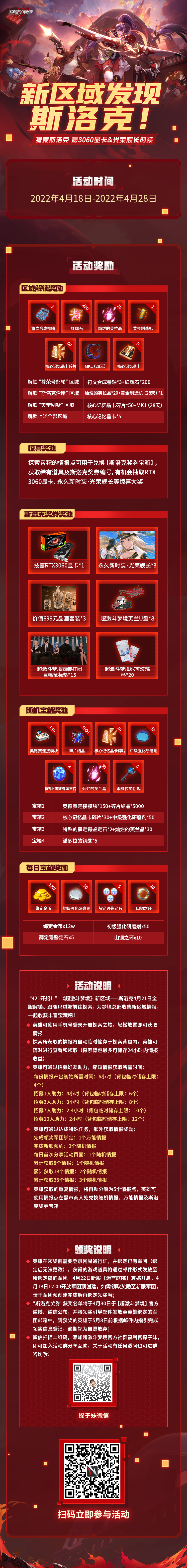 英雄们好,本期信息量过多,话不多说! 前方高能,速看! 版本前瞻! 斯洛克版本全内容曝光! 具体奖励请以正式服为准 全新区域“斯洛克”即将开启,17个全新副本来袭,花式机制更好玩! 全新机制:避障逃生、极限塔防、匿声潜行等新机制等你挑战! 全新系统:武器觉醒系统上线,伤害提升不是梦!解锁更多武器槽位,全面提升如虎添翼! 全新活动:航海主题活动,航海寻宝等你来!守卫海岛遗迹,探秘洞天宝窟,海量藏宝者出没,更有机会获得150级金装。 远征新福利:远征副本新增BUFF加持,给你满满安全感,更有金装鳞片,酷帅玄鲸坐骑等你来拿。 回归奖励大升级:上线领限定称号“爷回来了”,登录即送战斗祝福使用券!海量福利恭迎英雄回归! 全新时装、卡牌:更有全新时装【光荣舰长】、限定时装【金芒耀日】、全新卡牌【幻海寻宝者】齐上线,等你抱走! 各种精彩内容都在即将上线的【怒涛破晓】版本中劲爆登场(4月21日版本更新,22日新服开启)! 新区域开启! 斯洛克探索计划! 《超激斗梦境》新区域——斯洛克将于4月21日解锁。跟随玛琪娜前往探索,收集新区域情报,一起收获丰富的宝藏吧! 扫码即可参与活动 活动时间:2022年4月18日-2022年4月28日 活动期间,英雄可使用手机号登录开启探索之旅,轻松放置即可获取情报。还可通过招募好友助力,缩短情报获取所需时间,达成特殊任务,也可以额外获取情报奖励。 获取情报,解锁区域,探索斯洛克地区更有游戏道具、永久新时装、精美周边、RTX3060显卡等你来拿! ?参与方式及更多活动详情,请查看下方海报~戳文末【阅读原文】即可参与活动! 新服预约! 【迷宫庭院】预约开启!! 《超激斗梦境》全新服务器:【迷宫庭院】已于今日(4月18日)开放预约!全新区域即将开启,多种玩法“船新”上线,欢迎英雄们前往探索! 激动的心!颤抖的手!探子兄已经要按耐不住了! 让我们一起一起期待4月21日“怒涛破晓”新版本的华丽上线!新地区、新副本、新系统……海军主题活动与炫酷时装等劲爆新内容待英雄们探索! 更多资讯请关注叶子猪超激斗梦境官方合作专区。 编辑:叶子猪小秘书