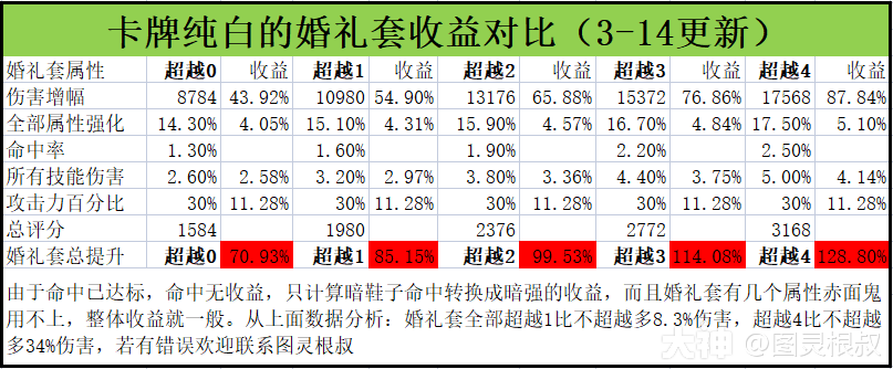 大家好,我是图灵根叔,这次春节礼包送了很多【核心记忆晶卡】以及三星卡牌自选箱子,很多小伙伴都咨询哪套卡牌收益高,有没有必要超越等相关问题。 要算卡牌收益,就需要知道具体面板,以下就拿粉丝群群友提供的站街面板图来计算副本里【婚礼套】的收益。 下图是卡牌全脱掉的站街图,站街攻击力百分比为48%(需要手动计算,装备上的词条+魂石阵的收藏加成+装备套装属性里的攻击力百分比加成+技能潜力里的武器攻击力),装备上有影响卡牌收益的符文:超然睚眦必报3+疯狂庆典3+赤魂暴走3+超然振奋3 经过整理与计算,得出以下结果,纯理论计算,每个号面板不一样,仅供参考 超越0与超越4的差距,只有34%,没有传言中说的那么夸张提高1、2倍伤害。 有条件的可以抽卡牌超越,不想花太多钱,也可以每周花点龟裂石换黑小丑超越卡牌。超越后不仅增加伤害,还能加不少评分。 即使是超越0一套,都能提升71%伤害,所以多号党切号后忘记带卡牌,伤害低了很多。 接下来有空再计算四天王与冬日的收益,方便比较,敬请期待。 编辑:叶子猪小秘书