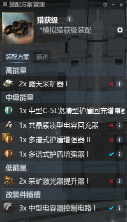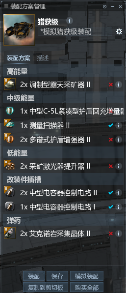 作为一个没有战斗技能只会挖矿的矿工,来分享一下我在00挖矿用的配置 顺便为军团招新 注意:本贴配置主要适用于独自挖矿没有矿队的情况 首先就是题目所说的只要10天就能上的猎获级配置 为什么用猎获级呢,因为别的船扛不住00的怪啊,如果你有牛逼的矿队大佬罩着你那当我没说 这套配置的主要问题在于为了节省成本,电会不够,几乎所有装备都是t1 因此需要把电容系统操作、电容管理学、护盾补偿等技能挂一下,目测挂到3就差不多了,反正工程学挂了永远不会亏 当然,如果不差钱的话把改装件换成t2的也行,只不过一个t2改装件比整条船还贵.... 另外还需要根据挖矿地区不同,更换抗性为针对抗,我这里是天使怪,直接全抗就OK了 如果没有队友的话,还需要根据怪的属性带上几个轻无,轻无可以打掉战列以外的怪,剩下的战列只要不超过3个,你绕着矿石转就能抗住了 ============================== 如果打算长期挖矿的话,我推荐先在猎获用上t2矿枪以及t2采矿晶体,然后再上轻舟 我本人的完美猎获是这样子的 上t2矿枪后必须上子弹,不然没子弹的t2矿枪效率是不如t1的 另外还需要根据自己驻地有什么矿挂出相应子弹的技能,可以先挂出t1子弹,再挂t2子弹 中槽的测量扫描器是我自己的偏好,可以根据小行星余量提前结束矿枪的周期省时间 https://bbs.nga.cn/read.php?&tid=22319505 编辑:大主顾
