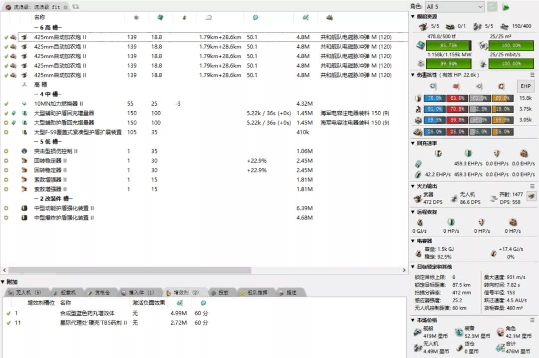 先上配置,这套配置的装备都是最普通的T2装,非常便宜,一个大盾扩结合两个大注盾(辅助护盾回充增量器),由于流浪级舰船具有护盾回复加成,因此防御非常可观,配合大护盾及突击损控提供的缓存,操作合理的情况下堪称不死。
