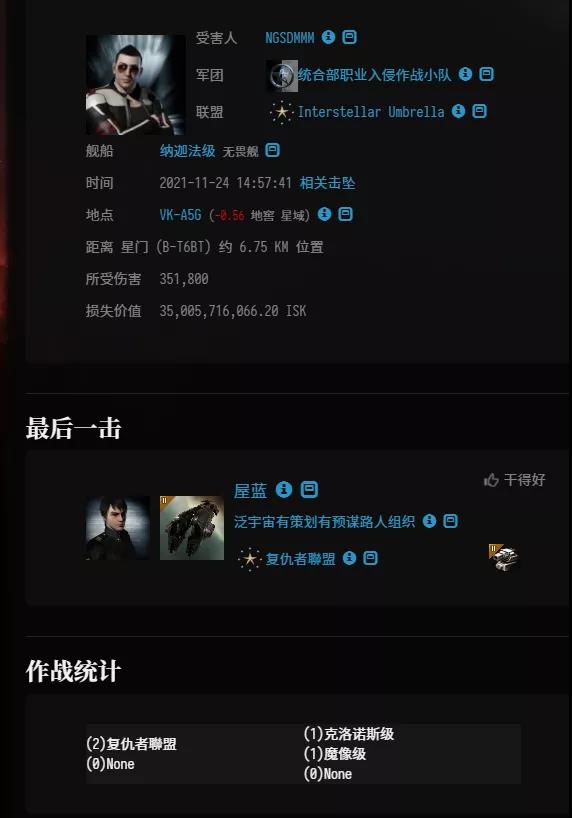 11月24日,一位ID为“屋蓝”的舰长驾驶克洛诺斯级掠夺舰巡航的时候,在V-KA5G星系星门前遇到前来防御的纳迦法级无畏舰。