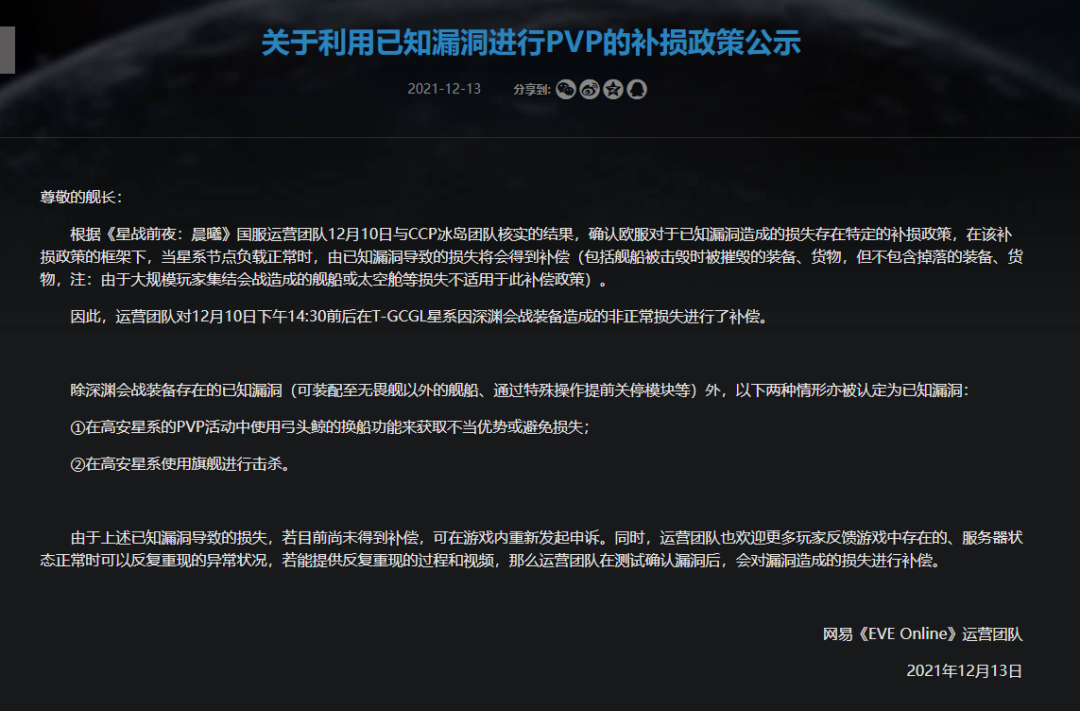 同一天,经过运营团队和ccp冰岛团队核实,利用已知漏洞进行pvp补损公示也被发布,以前和以后此类恶意利用bug违规行为造成的损失可以申请补损——包括但不限于被利用高安弓头鲸换船功能获取不当优势击杀的舰长。