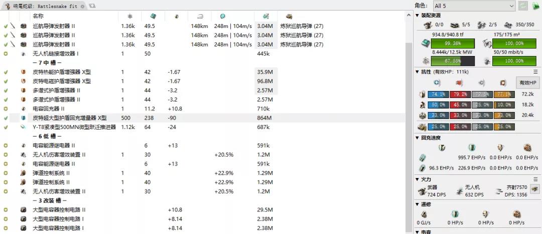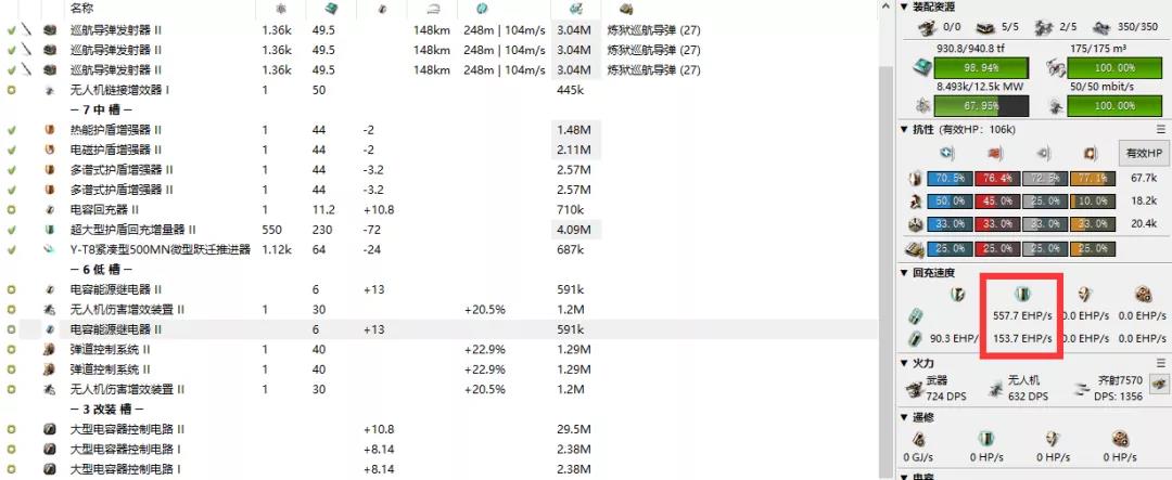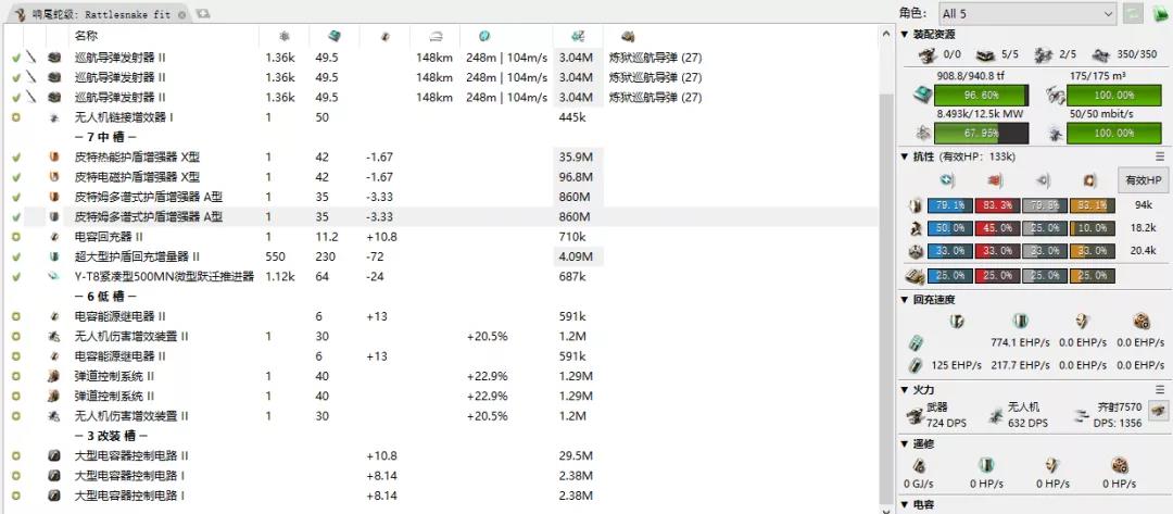还是拿我们的响尾蛇举例,假设这是一艘要去刷血袭者的响尾蛇,在它的盾抗装备均为T2的前提下,每秒可以抵抗的伤害为557。