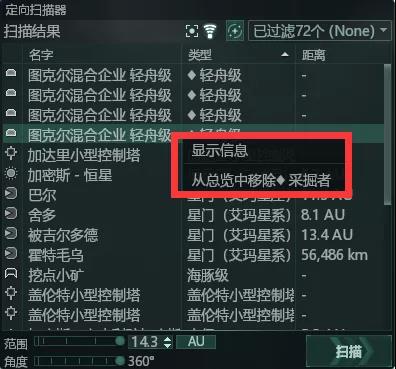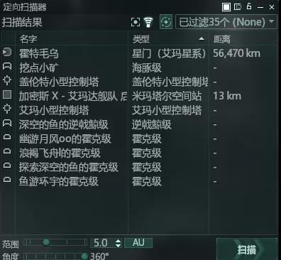 我们可以看到,星系中存在不少采矿舰船,并且范围在5AU内,答案很简单,3AU距离有一处清冰带,海盗定扫就是通过这种方式定位敌人的,只不过5°定扫的难度要更高一些。