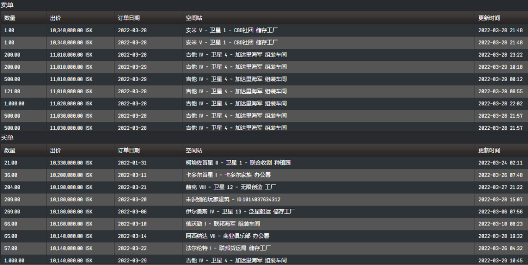 纵观整个伊甸币的买单卖单市场,伊甸币跌至10M的原因不难理解,28日某位(或者是某些)大佬急需用ISK,他将自己手里的伊甸币大量抛售,导致市场上超过10M的收单全部被“消失”,价格自然也就奔着10M去了。
