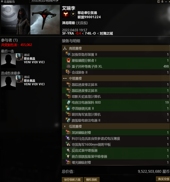 4月3日晚九点左右,3V联盟的一条黑隐在反收割时遭遇老兄弟伊什塔队强势围观。虽然这条黑隐的装备非常豪华——而且相信小伙伴们也曾经竭力挽救过它的生命,可是最后它还是被老兄弟们的无人机淹没,化作了星尘,默默地守护着特布特。