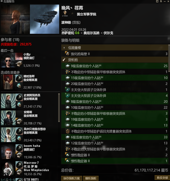 4月1日愚人节当天,一条运载着大量监察官财产的货舰在乔萨密陀星系被强行击杀。虽然在该星系货舰和跳货惨遭毒手已经不是新闻,但是苦主一次性运输(包括掉落)数额如此之大的监察官财产着实令人称奇。