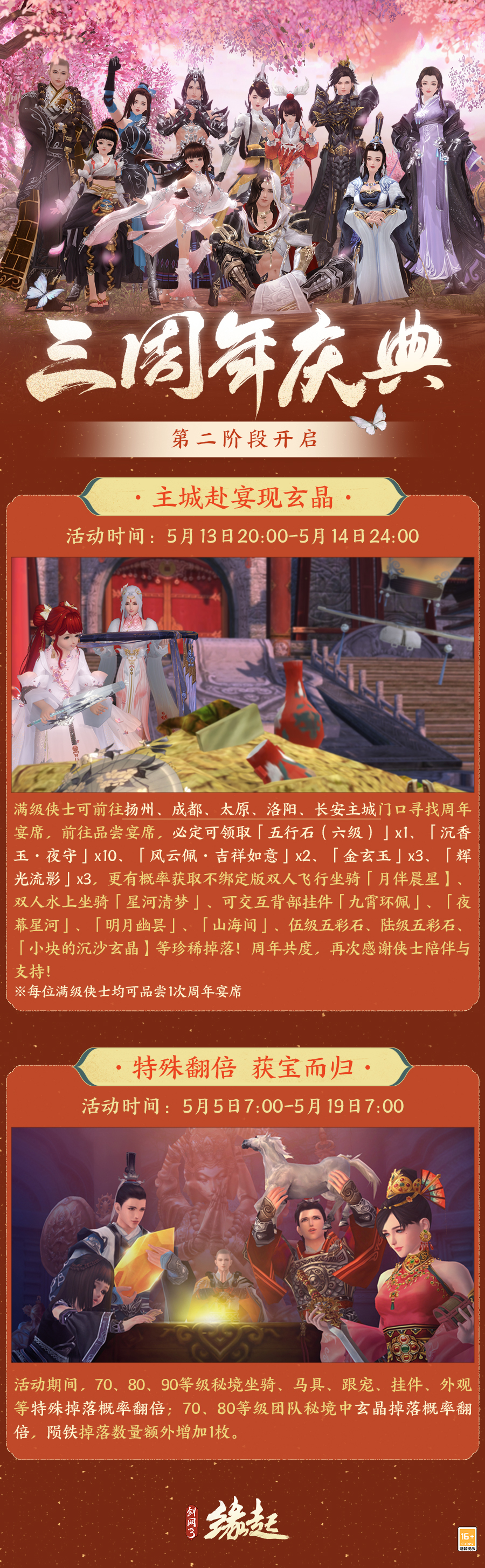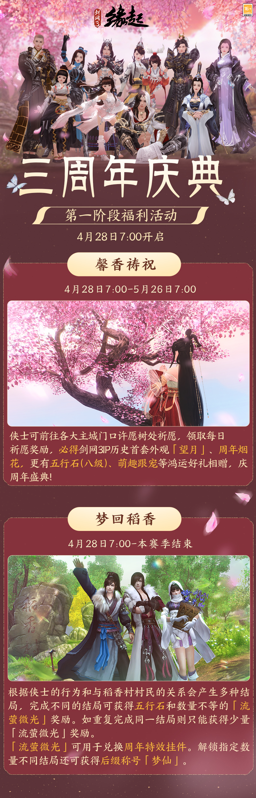 周年盛典开启 主城宴席全民共庆 《剑网3缘起》周年庆典今日开启!多重惊喜福利焕新上线,特殊掉落翻倍活动火热进行中!今晚八点,各大主城还将设下周年宴席款待,感谢大家长久以来的陪伴,祝侠士们欧皇附体,小红手一摸珍稀玄晶尽揽囊中! 周年盛典更有福利加码,秘藏豪礼倾情相赠!即日起至5月26日7:00活动期间,满级侠士前往游戏内花萼楼即可领取珍稀奖励自选礼盒「隐元秘宝·拾忆·乾」,开启后可从奇趣坐骑、萌趣跟宠、华美挂饰、珍奇道具等多种珍贵典藏中任选其一,铭刻江湖同游之谊! 梦回稻香 馨香祷祝 侠士可还记得初入江湖时的悸动?「梦回稻香」周年活动限时开放中,参与即得周年挂件「沧溟流辉·银涟」、专属活动称号「梦仙」等奖励!前往主城许愿树处祈福,必得剑网3IP首套外观「望·月」及周年烟花,更有跟宠「天字皓壹」、「五行石(八级)」等好礼相赠,共庆周年盛事! 《剑网3缘起》三周年盛典华章再启,丰富周年回馈奖励上线即领!新朋旧友齐聚主城宴席,江湖轶事共话稻香旧梦,海量豪礼轮番惊喜登场!让我们执剑踏歌,共赴这场满载回忆的盛会,期待与诸位再谱武林新篇! 编辑:月光下完美