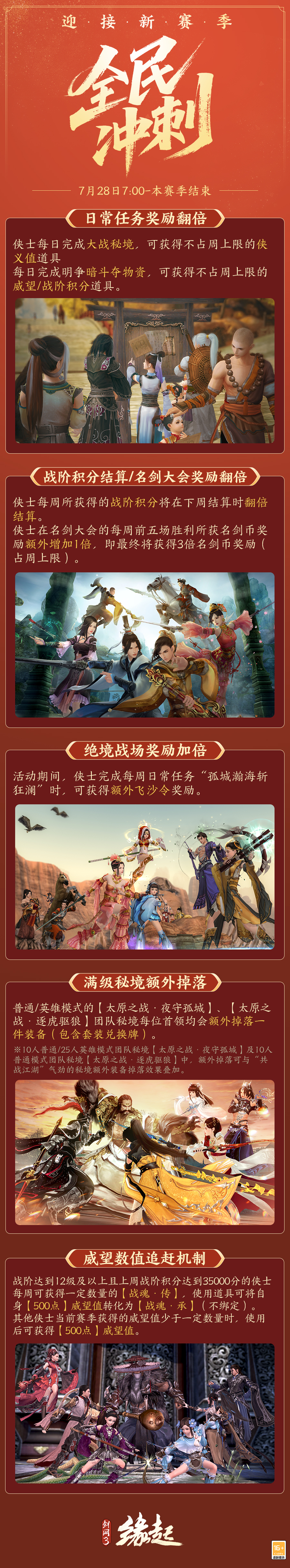 剑啸江湖风云变,琴音雅韵谱新篇!全新「剑胆琴心」赛季即将上线,新门派“长歌门” 震撼来袭,等级上限同步开放至 95 级,江湖再掀风云!新赛季开启后,系统将自动结算侠士在上一赛季的战绩,赛季相关数值按比例兑换丰厚奖励,名剑大会将依排名发放专属荣誉!赛季加速今日上线,新赛季预热活动「当世长歌」同步开启,参与即可兑专属背挂「万古星极」,助力侠士开启江湖新篇。 赛季结算细则 新赛季开启当天维护结束后,系统会对侠士的威望值、战阶等级、名剑币、侠义值、飞沙令、沉香玉?逐虎进行结算清零,并按照相应比例兑换成奖励。侠义值和威望的周上限,以及战阶积分相关的数值道具(包括邮件内的道具),会在新赛季时进行废弃,侠士可卖至商店,按一定比例转换成金钱。 名剑大会按排名可获得背部挂件「戾夭弯刀」、腰部挂件「金鲤螺纹镜」,以及专属称号奖励。 赛季加速助力 「烽火燎原」赛季加速今日开启,多种玩法开启翻倍奖励。秘境挑战、阵营对抗以及日常等各类玩法都能获得额外数值货币掉落,助力侠士们全速冲刺,为新征程做好充分准备! 新赛季预热开启 新资料片「剑胆琴心」预热活动「当世长歌」今日开启,侠士可协助长歌门众人探查“龙图卫”及“一刀流”在中原地区活动的意图,力破永王阴谋、搭救建宁王。参与日常活动还可获得活动代币,用于兑换活动奖励。可用于兑换成长型神兵升阶道具「金玄玉」、不限时背部挂件「万古星极」、1210品级全套装备(除武器外)等豪礼,为过渡到新赛季添砖加瓦。 赛季预热赛季加速同步开启,更多精彩活动等待侠士探索。快来加入《剑网3 缘起》,一起迎接 “剑胆琴心” 赛季的到来吧! 编辑:月光下完美