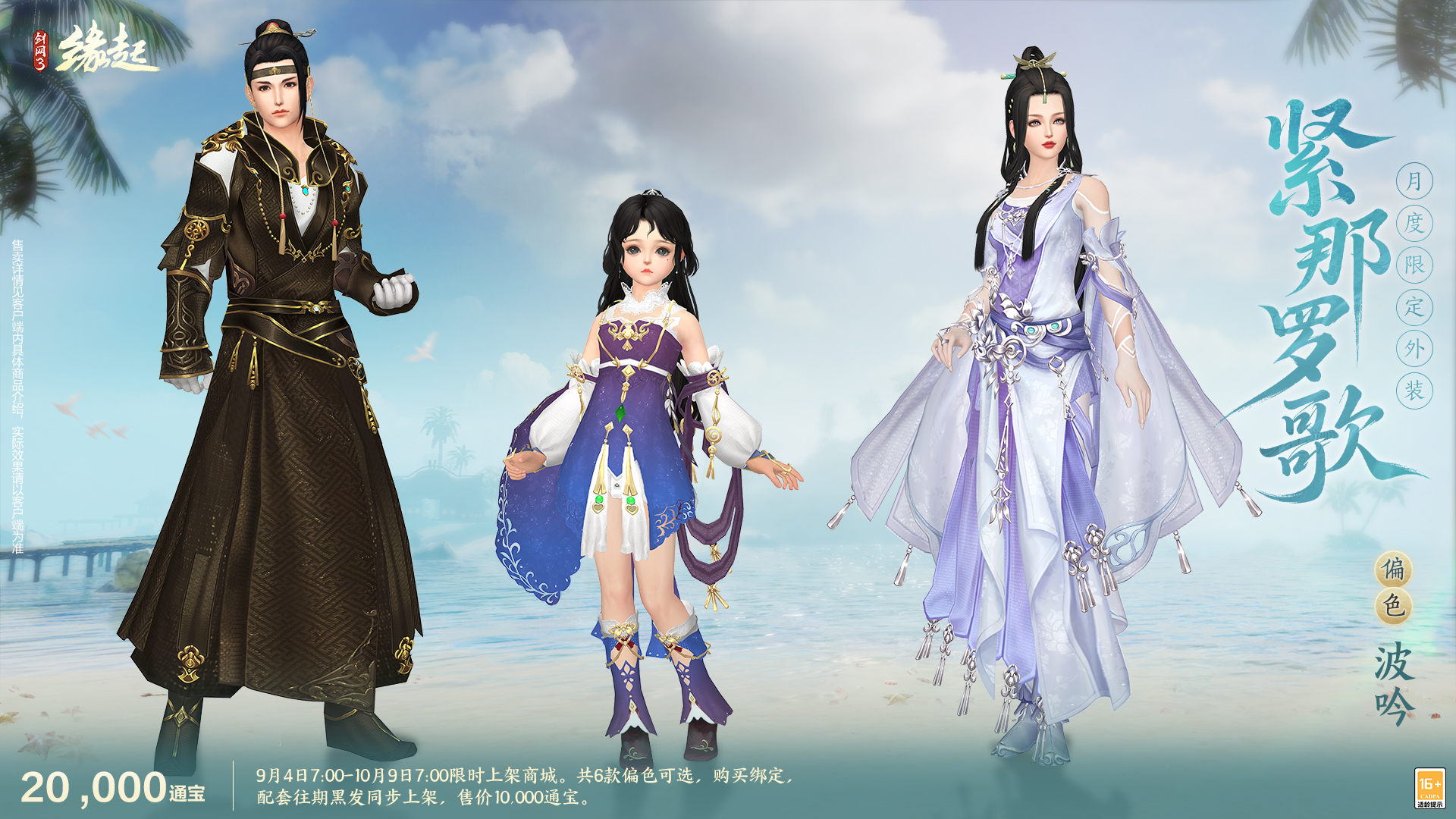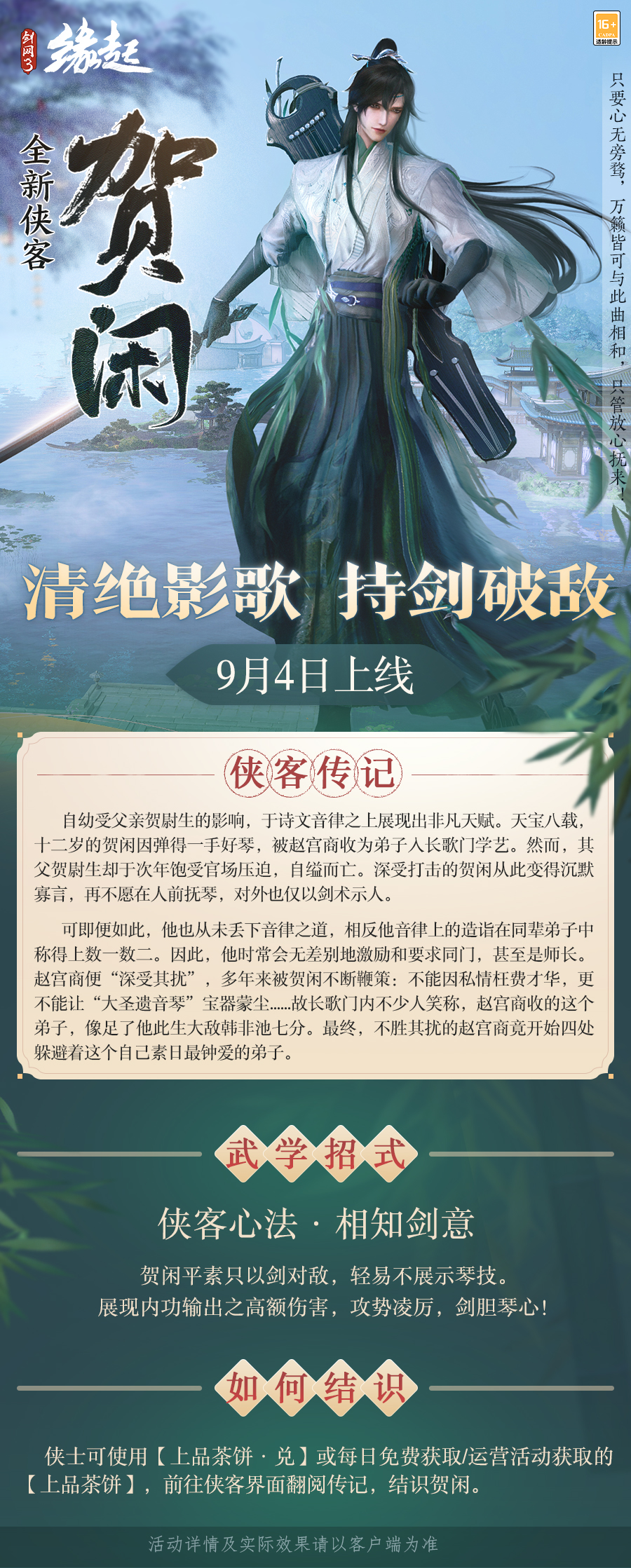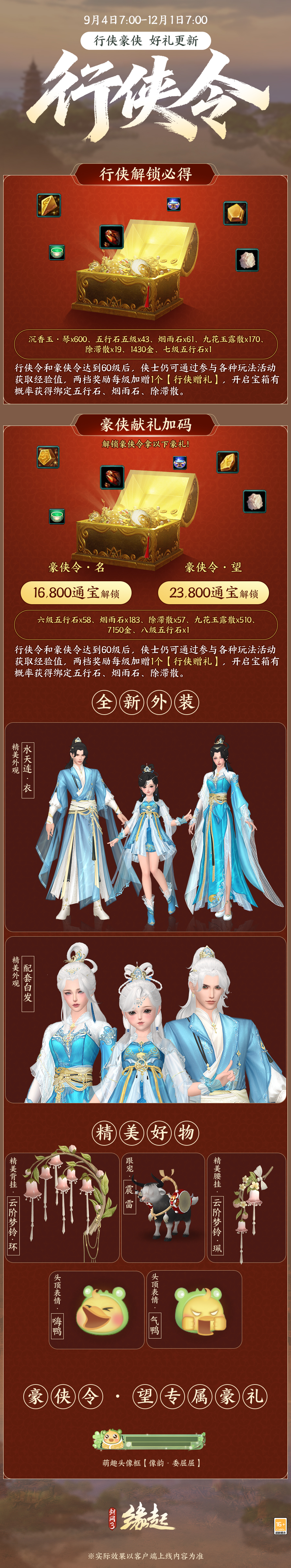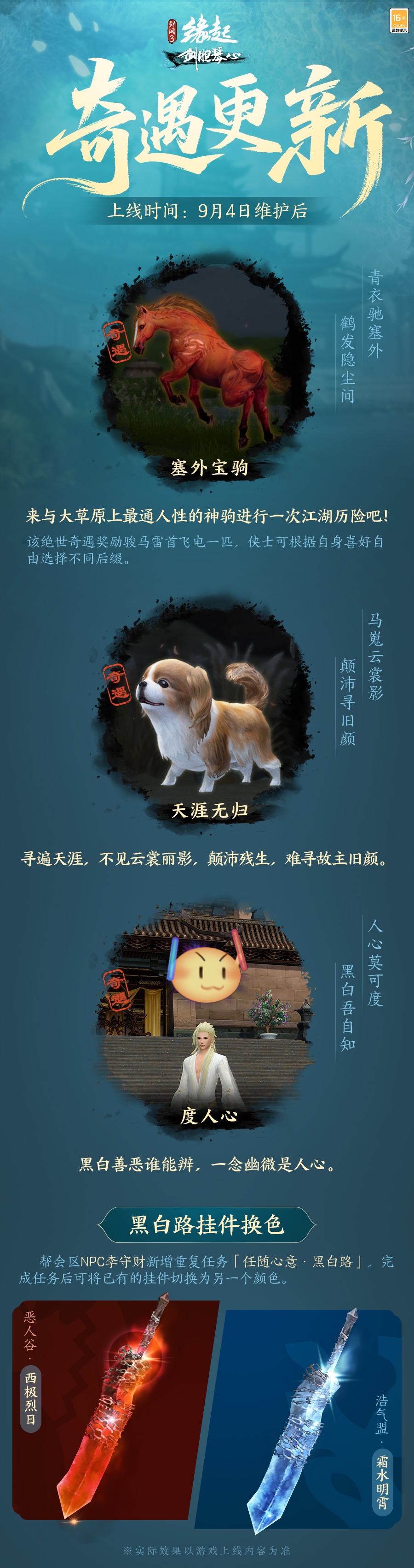 「剑胆琴心」赛季震撼启幕,95级等级上限正式开放!全新门派长歌门惊艳登场;轻功系统同步升级,助侠士纵览江湖更添潇洒;长歌门、千岛湖等新场景携新世界首领上线;「永王行宫?仙侣庭园」等秘境待你挑战;「宠物手记」解锁摸宠新趣,「朔风掠影」跑商、「塞外宝驹」奇遇等玩法焕新,更有七级五行石、特价橙武礼盒与「行侠令」新好礼等福利,邀侠士共赴新程! 95级焕新江湖 长歌门携新玩法登场 好礼惊喜齐相赠 新赛季好礼不断 惊喜好礼齐相赠 等级突破,赠礼相伴,新赛季福利狂欢开启!活动期间内,达到95级的角色可在花萼楼领取启程好礼一份!可获得七级五行石等好礼相赠。全新活动「大唐图鉴」即将登场,完成日常和新玩法得图册解锁图鉴,不仅可获免费易容次数和免费体型自定义次数,更有机会获得1100品定制橙武礼盒,该礼盒享600通宝拓印特价,超值优惠活动不容错过!「行侠令」好礼同步更新,每周参与玩法解锁金币、五行石等江湖实用好物,更有绑定版七级五行石相赠!豪侠令赠礼加码,更有全新外装、精美好物及专属头像框等好物等你来拿。侠士速来参与活动,尽情畅享新赛季! 95级启新章 长歌门携琴音闯江湖 一琴一剑一江湖,清韵绕梁藏侠骨,等级上限开放至95级,全新门派长歌门惊艳亮相。长歌门武学独具特色,以内力催发琴音,轻则惑人心性,重则伤人无形,亦能奏律平复伤势,更融古圣贤天地自然之道,成就“气与曲合、琴音鸣剑”的核心风格。琴与剑随心切换,攻防兼备,其加入为江湖战局添新变数,全新篇章正待侠士开启! 永王秘境风云起 新域同步待侠征 汉王旧事风云涌,各路豪杰展雄威。全新团队秘境「永王行宫?仙侣庭园」震撼开启,此地揭开汉王杨谅旧部后续故事的神秘面纱,神偷世家卫家、心怀算计的公冶菱等势力纠葛不断,谢云流、李重茂等人物也在此上演精彩剧情,李白身份更是扑朔迷离。团本内屈焰阳、森九岚等多位风格迥异、实力强劲的首领严阵以待,等待侠士组队挑战。同时,微山书院、梵空禅院等全新大战秘境,以及剑踪幻域新地图「璨翠海厅」也同步上线,为侠士们带来更多冒险选择,诚邀诸位共赴新的秘境征程! 朔风掠影添商趣 全新对决燃新章 热血战斗再度点燃!95赛季晶矿争夺战震撼开启,阵营日常迎来全新战场。全新跑商玩法「朔风掠影」正式上线,打破阵营强弱限制,重新划分势力。绝境战场新地图「沧溟绝境」也将惊艳登场,东海群岛坐拥溶洞、火山、密林等复杂地形,搭配随时间收缩且可能随机移动的“海龙卷”缩圈机制,为战斗增添更多变数。侠士速速整装集结,定要在新战场大展身手! 奇遇手记新上线 奇遇侠客焕江湖 趣味江湖焕新登场!新赛季PVX内容惊喜不断,多样玩法等你探索。「奇遇手记」功能9月4日上线,新奇遇「塞外宝驹」「天涯无归」「度人心」携全新宠物奇遇同步上线,带来与神驹历险等别样体验,黑白路挂件新增可换色功能。全新侠客贺闲亮相,这位凭剑术与音律造诣出众的角色,将以“相知剑意”展现凌厉攻势,结识后可成为侠士行走江湖的一大助力。生活技能迎来大改造,生活装备新增三条属性,新装备助力生产,成长路径更自由,通过百工行材料捐赠、图鉴收集等玩法,还能兑换挂件、跟宠和坐骑。诸多精彩已就绪,期待侠士开启这段趣味之旅! 装点新赛季 外观新品一览 碧羽裁云凝雅韵,浪海飞天绘新途。江湖全新好物登场,邀你共焕新季风采!奢华包身礼盒「碧翎叠云」以纯白衬碧色,翎羽纹饰随衣袂轻扬,仙气满溢全程;特效外观「浪海浮波」踏浪来袭,衣摆晃动如碎浪翻涌,触发特效时海浪虚影环身,裹挟着海风的清凉感扑面而来;月限外观「紧那罗歌」取意敦煌飞天神韵,衣袂化作流云飞带,随步生风灵动飘逸;金发「卧梦楼兰」融西域风情,金饰点缀间满是神秘贵气;萌兔挂宠软萌模样治愈所有闯荡疲惫;金发同款特效头像框「像韵?卧梦楼兰」流光闪烁,甜兔头像框及表情包自带可爱buff;更有三档充消赠礼携1.5倍积分回馈开启,入手心仪好物还能多赚积分,让惊喜与实惠常伴侠途! 奢华包身礼盒「碧翎叠云」 碧羽裁成云外裳,叠叠轻绡映日光,全新奢华包身礼盒「碧翎叠云」悄然降临。以纯净白为底,搭配清新碧色,似云雾缭绕于青竹之间,衣袂舒展如羽翼轻振,翎羽纹饰与飘逸质感交融,演绎出云间灵羽的唯美。 成男款广袖飘逸,袍身线条流畅,碧色翎羽纹饰灵动分布,暗绣碧色翎羽于衣袂间翩跹欲飞,勾勒出清风朗月般的温润出尘之姿; 成女款裙裾层叠,缀满银线绣制的碧色翎羽自袖侧倾泻而下,行走时,翎羽似随步伐轻晃,优雅动人,将女子的柔美与灵动完美融合; 萝莉款雪纺裁就的碧色衣裙仿若云絮轻叠,数百片渐变翎羽如流霞翩跹,层层交叠间似将少女笼罩在碧色光晕中,灵动娇憨的气质呼之欲出。 售卖信息: 售价88,800通宝, 礼盒包含成衣+左肩饰+右肩饰+披风+包身外观效果, 不绑定款9月4日20:05限量上架300份, 绑定款9月4日20:13-10月9日7:00限时上架。 特效外观「浪海浮波」 碧海无垠,浪卷潮生,全新特效外观「浪海浮波」踏浪而来。以莹白为底,搭配清透色彩,似将海洋的灵动与澄澈凝于衣间,衣摆晃动如海浪起伏,饰纹若波光闪烁,诉说着关于浩渺大海的浪漫。 成男款以极简剪裁勾勒利落廓形,腰间缠绕的饰带缀满贝壳浮雕与浪花暗纹,随步伐轻扬生姿; 成女款以银丝暗绣的雪色绡衣搭配曳地云纹