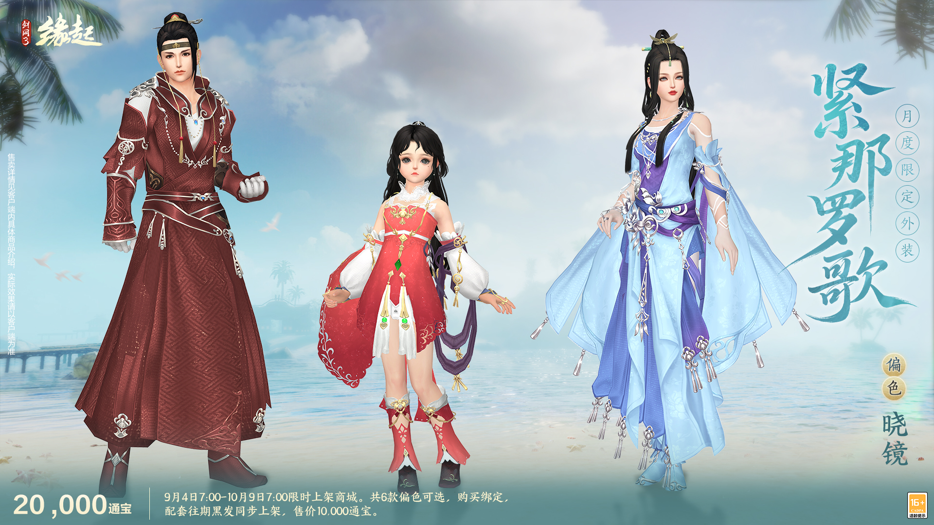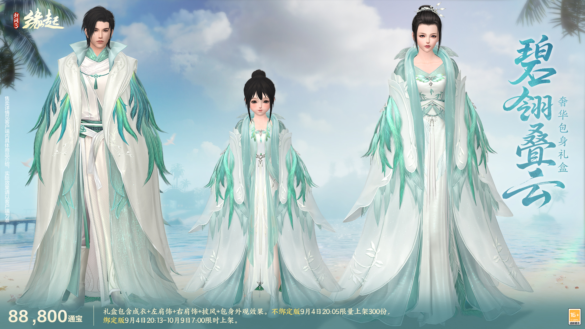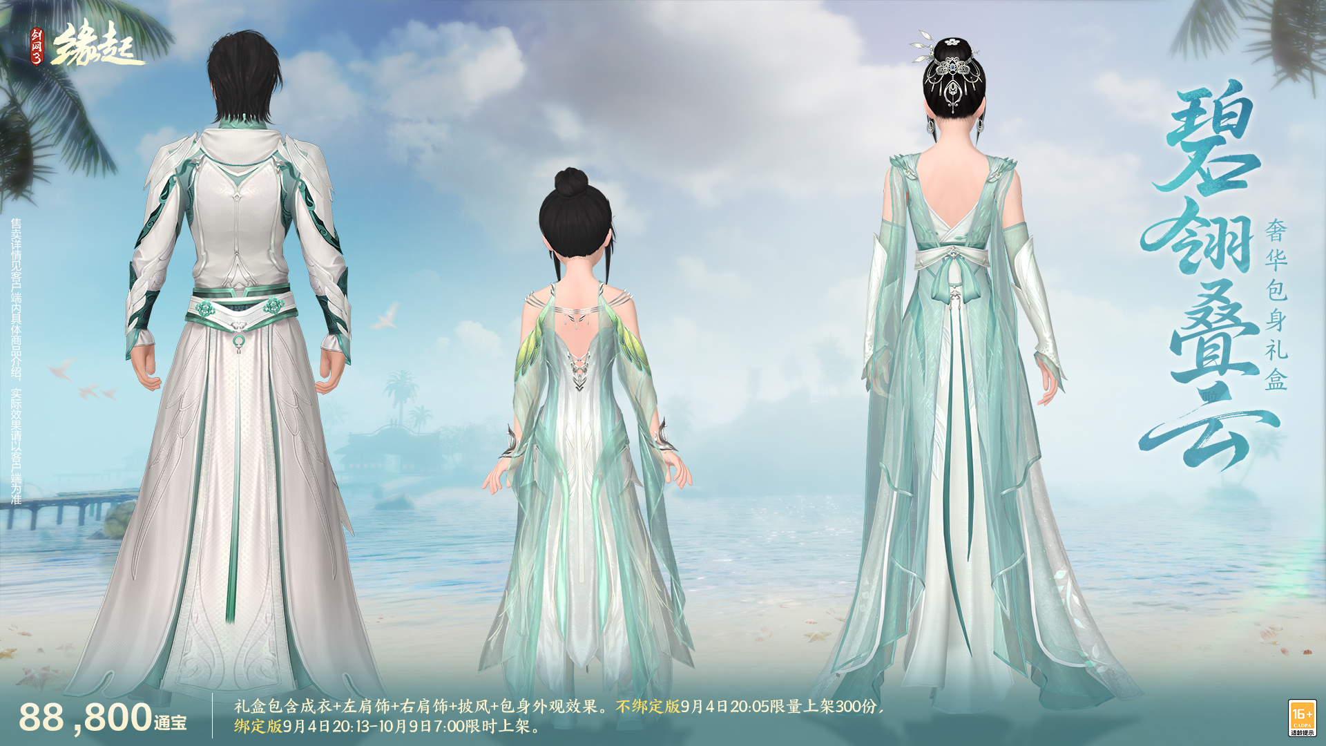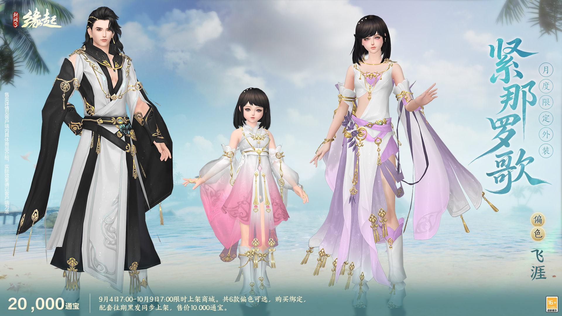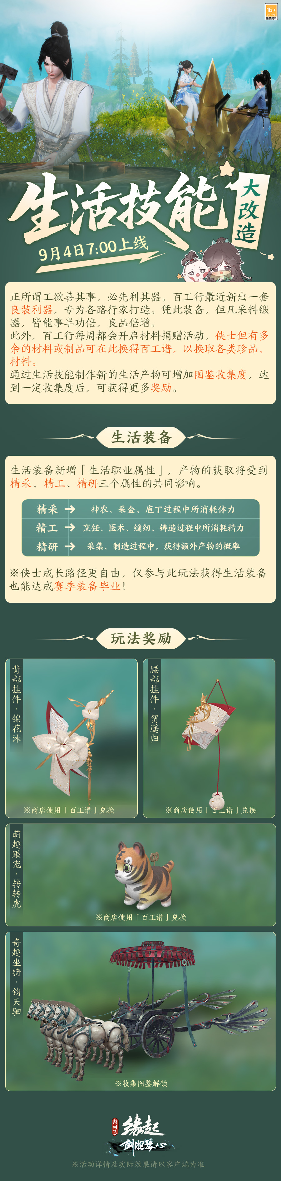 「剑胆琴心」赛季震撼启幕,95级等级上限正式开放!全新门派长歌门惊艳登场;轻功系统同步升级,助侠士纵览江湖更添潇洒;长歌门、千岛湖等新场景携新世界首领上线;「永王行宫?仙侣庭园」等秘境待你挑战;「宠物手记」解锁摸宠新趣,「朔风掠影」跑商、「塞外宝驹」奇遇等玩法焕新,更有七级五行石、特价橙武礼盒与「行侠令」新好礼等福利,邀侠士共赴新程! 95级焕新江湖 长歌门携新玩法登场 好礼惊喜齐相赠 新赛季好礼不断 惊喜好礼齐相赠 等级突破,赠礼相伴,新赛季福利狂欢开启!活动期间内,达到95级的角色可在花萼楼领取启程好礼一份!可获得七级五行石等好礼相赠。全新活动「大唐图鉴」即将登场,完成日常和新玩法得图册解锁图鉴,不仅可获免费易容次数和免费体型自定义次数,更有机会获得1100品定制橙武礼盒,该礼盒享600通宝拓印特价,超值优惠活动不容错过!「行侠令」好礼同步更新,每周参与玩法解锁金币、五行石等江湖实用好物,更有绑定版七级五行石相赠!豪侠令赠礼加码,更有全新外装、精美好物及专属头像框等好物等你来拿。侠士速来参与活动,尽情畅享新赛季! 95级启新章 长歌门携琴音闯江湖 一琴一剑一江湖,清韵绕梁藏侠骨,等级上限开放至95级,全新门派长歌门惊艳亮相。长歌门武学独具特色,以内力催发琴音,轻则惑人心性,重则伤人无形,亦能奏律平复伤势,更融古圣贤天地自然之道,成就“气与曲合、琴音鸣剑”的核心风格。琴与剑随心切换,攻防兼备,其加入为江湖战局添新变数,全新篇章正待侠士开启! 永王秘境风云起 新域同步待侠征 汉王旧事风云涌,各路豪杰展雄威。全新团队秘境「永王行宫?仙侣庭园」震撼开启,此地揭开汉王杨谅旧部后续故事的神秘面纱,神偷世家卫家、心怀算计的公冶菱等势力纠葛不断,谢云流、李重茂等人物也在此上演精彩剧情,李白身份更是扑朔迷离。团本内屈焰阳、森九岚等多位风格迥异、实力强劲的首领严阵以待,等待侠士组队挑战。同时,微山书院、梵空禅院等全新大战秘境,以及剑踪幻域新地图「璨翠海厅」也同步上线,为侠士们带来更多冒险选择,诚邀诸位共赴新的秘境征程! 朔风掠影添商趣 全新对决燃新章 热血战斗再度点燃!95赛季晶矿争夺战震撼开启,阵营日常迎来全新战场。全新跑商玩法「朔风掠影」正式上线,打破阵营强弱限制,重新划分势力。绝境战场新地图「沧溟绝境」也将惊艳登场,东海群岛坐拥溶洞、火山、密林等复杂地形,搭配随时间收缩且可能随机移动的“海龙卷”缩圈机制,为战斗增添更多变数。侠士速速整装集结,定要在新战场大展身手! 奇遇手记新上线 奇遇侠客焕江湖 趣味江湖焕新登场!新赛季PVX内容惊喜不断,多样玩法等你探索。「奇遇手记」功能9月4日上线,新奇遇「塞外宝驹」「天涯无归」「度人心」携全新宠物奇遇同步上线,带来与神驹历险等别样体验,黑白路挂件新增可换色功能。全新侠客贺闲亮相,这位凭剑术与音律造诣出众的角色,将以“相知剑意”展现凌厉攻势,结识后可成为侠士行走江湖的一大助力。生活技能迎来大改造,生活装备新增三条属性,新装备助力生产,成长路径更自由,通过百工行材料捐赠、图鉴收集等玩法,还能兑换挂件、跟宠和坐骑。诸多精彩已就绪,期待侠士开启这段趣味之旅! 装点新赛季 外观新品一览 碧羽裁云凝雅韵,浪海飞天绘新途。江湖全新好物登场,邀你共焕新季风采!奢华包身礼盒「碧翎叠云」以纯白衬碧色,翎羽纹饰随衣袂轻扬,仙气满溢全程;特效外观「浪海浮波」踏浪来袭,衣摆晃动如碎浪翻涌,触发特效时海浪虚影环身,裹挟着海风的清凉感扑面而来;月限外观「紧那罗歌」取意敦煌飞天神韵,衣袂化作流云飞带,随步生风灵动飘逸;金发「卧梦楼兰」融西域风情,金饰点缀间满是神秘贵气;萌兔挂宠软萌模样治愈所有闯荡疲惫;金发同款特效头像框「像韵?卧梦楼兰」流光闪烁,甜兔头像框及表情包自带可爱buff;更有三档充消赠礼携1.5倍积分回馈开启,入手心仪好物还能多赚积分,让惊喜与实惠常伴侠途! 奢华包身礼盒「碧翎叠云」 碧羽裁成云外裳,叠叠轻绡映日光,全新奢华包身礼盒「碧翎叠云」悄然降临。以纯净白为底,搭配清新碧色,似云雾缭绕于青竹之间,衣袂舒展如羽翼轻振,翎羽纹饰与飘逸质感交融,演绎出云间灵羽的唯美。 成男款广袖飘逸,袍身线条流畅,碧色翎羽纹饰灵动分布,暗绣碧色翎羽于衣袂间翩跹欲飞,勾勒出清风朗月般的温润出尘之姿; 成女款裙裾层叠,缀满银线绣制的碧色翎羽自袖侧倾泻而下,行走时,翎羽似随步伐轻晃,优雅动人,将女子的柔美与灵动完美融合; 萝莉款雪纺裁就的碧色衣裙仿若云絮轻叠,数百片渐变翎羽如流霞翩跹,层层交叠间似将少女笼罩在碧色光晕中,灵动娇憨的气质呼之欲出。 售卖信息: 售价88,800通宝, 礼盒包含成衣+左肩饰+右肩饰+披风+包身外观效果, 不绑定款9月4日20:05限量上架300份, 绑定款9月4日20:13-10月9日7:00限时上架。 特效外观「浪海浮波」 碧海无垠,浪卷潮生,全新特效外观「浪海浮波」踏浪而来。以莹白为底,搭配清透色彩,似将海洋的灵动与澄澈凝于衣间,衣摆晃动如海浪起伏,饰纹若波光闪烁,诉说着关于浩渺大海的浪漫。 成男款以极简剪裁勾勒利落廓形,腰间缠绕的饰带缀满贝壳浮雕与浪花暗纹,随步伐轻扬生姿; 成女款以银丝暗绣的雪色绡衣搭配曳地云纹