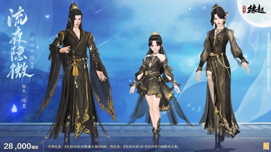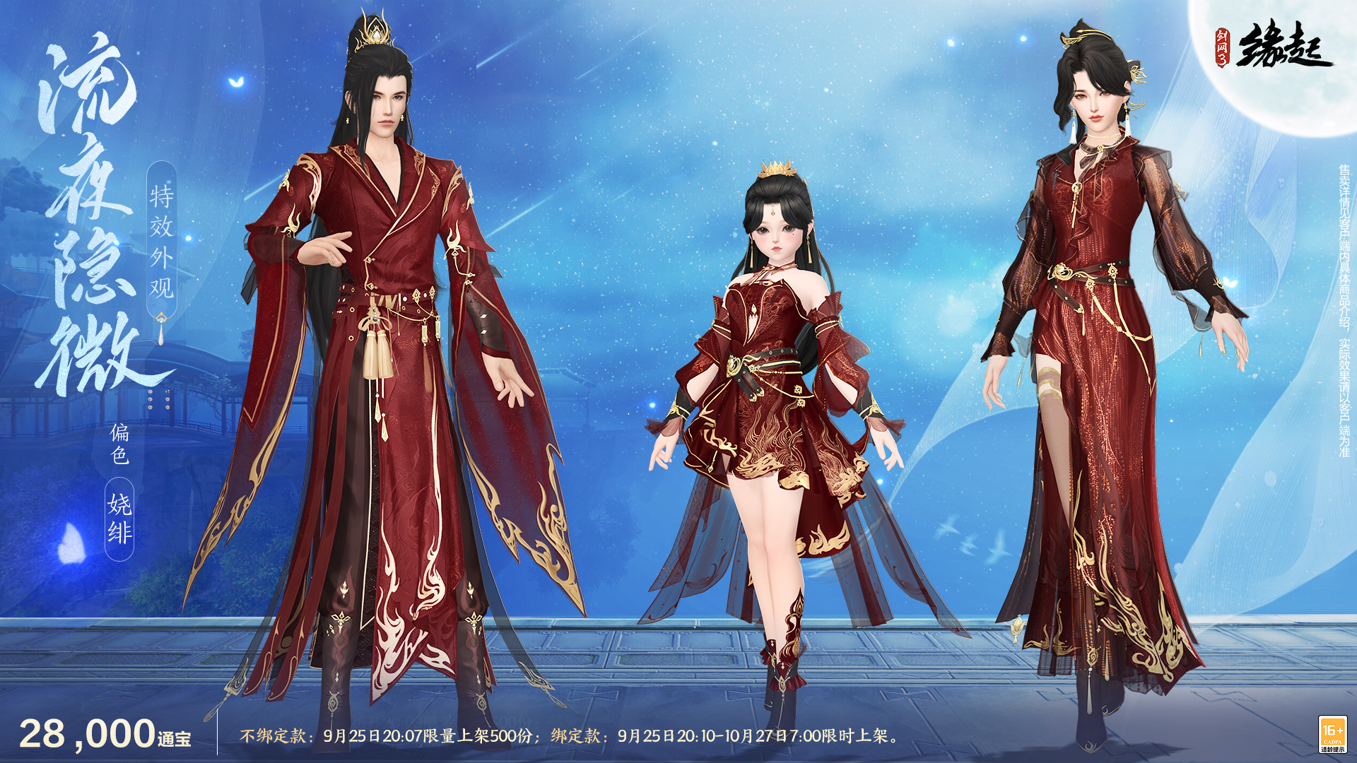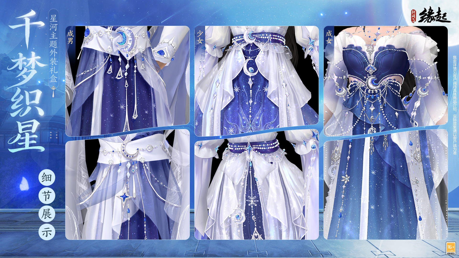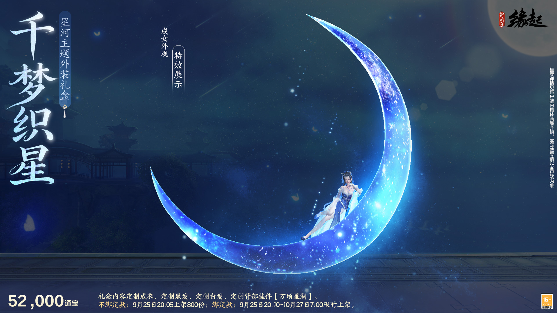 中秋遇国庆,家国共团圆!《剑网3缘起》双节专属活动重磅开启,海量福利邀侠士共庆佳节。国庆节“七天有乐”活动,可通过官方微博、公众号每日领取盛典赠礼激活码,兑换节日好礼;“如意千秋”经典活动回归,可通过参与国庆系列任务获取活动代币「如意绳」,通过代币能在主城活动区【郑平安】处兑换28格超大容量背包「千秋锦盒?乙巳」及腰部挂件「曜晶飞云纹香囊」等节庆好物;中秋活动同步开启,签到即可领取精美双人奇趣坐骑「月浮仙洲」。前往主城活动区参与中秋系列活动可得「吉庆赏钱」,可在中秋节日商店兑换全新腰部挂件「梦佳期」及往期节日挂件等中秋限定佳品;“欢庆延续”期间,每日完成大战或阵营日常,即可获得1份不绑定「福禄宝箱?剑胆琴心」。此外,国庆8天专属激活码福利同步上线,多重惊喜助力侠士畅玩双节,共谱江湖欢乐篇章! 商城焕新喜迎双节 金秋送爽,国庆中秋双节齐至,《剑网3缘起》全新江湖好物集结登场,为侠士们呈上满满惊喜!全新星河主题外装礼盒「千梦织星」踏月而来,成衣与挂件皆带星河特效,将星月浪漫融于衣间,尽显雅致仙气;全新特效外观「流夜隐微」惊艳亮相,以独特暗夜格调设计,利落劲装勾勒飒爽英姿,举手投足间流转着高阶质感,解锁江湖穿搭新范式;特效世界称号「月牵虹」同步上线,以冰晶月牙为核心,蓝色光效灵动环绕周身,佩戴即享环身高光;更有全新充消赠礼开启,最高档还能解锁奇趣坐骑「马儿跳跳」,双节福利丰厚,助你焕新行装,自在畅游江湖! 星河主题外装礼盒「千梦织星」 引月华作线,裁星河为绢,织入三千琉璃梦。《剑网3缘起》原创星河主题外装礼盒「千梦织星」踏月而来。 凝霜雪为底,融夜阑作染,通体清辉流转。衣袂皆取流光之纱,层层相叠,行走间宛若踏月而来,周身星河随行,九霄倾落。银丝走线,勾勒出星沉之景,又以珠玉点睛,尽显九天清寒。 成男款月白外袍,交领严整,肩裁峭直,如远山覆雪。星轨银纹沿襟而下,幽蓝宝玉嵌于其间,似夜幕缀星。腰间银带横陈,一钩弯月冷然。 成女款坠以纤纤银链,月魄泠泠垂于胸前。外罩层叠轻纱,如云似雾,其上银辉点点,渺若辰星。裙裾曳地,星河流淌其上。 萝莉款双髻伶仃,银冠小巧。短衫雪白,双袖蓬然,如含苞之菡萏。星蓝短裙,俏丽无邪,外曳一袭长短参差的流纱,如蝶翼轻展。皓足纤袜,星纹细描,步履间皆是灵气。 售价52,000通宝。 礼盒内容定制成衣、定制黑发、定制白发、定制背部挂件「万顷星澜」。 不绑定款:9月25日20:05限量上架800份; 绑定款:9月25日20:10-10月27日7:00限时上架。 特效外观「流夜隐微」 霓裳裁月缀星纹,剑影摇光夜未央。全新特效外观「流夜隐微」礼盒靓丽来袭。 以流光铄金,手绣出腾云、卷浪、升龙之暗纹。金线游走于绸缎之上,幽暗中折射出微光,不动时如潜龙在渊,行动时则若惊雷乍现。衣衫剪裁多用斜线与锐角,锋芒毕露,层叠的薄纱与垂坠的布帛营造隐秘尊贵之感。 成男款采用交领长袍样式,衣摆较长,行走间更显飘逸。衣袖宽大,边缘有精致的纹路装饰。腰间束着宽腰带,搭配金属质感的扣饰与挂坠,一侧还挂着小巧的配饰,整体造型俊朗又不失雅致。 成女款为修身长裙造型,领口设计别致,露出部分肌肤,增添了几分妩媚。长袖轻薄,带有层叠的设计,灵动飘逸。腰间有精致的束带,搭配装饰性的挂件,裙摆长且带有开衩,行走时更显优雅曼妙。 萝莉款整体是短裙造型,上衣为露肩设计,搭配精致的臂饰。裙摆蓬松,行走间活泼俏皮。长袖带有流苏装饰,随着动作轻轻晃动。腰间束着细腰带,搭配小巧的挂饰,尽显娇俏可爱。 售卖信息: 售价28,000通宝。 不绑定款9月25日20:07限量上架500份,绑定款9月25日20:10-10月27日7:00限时上架。 特效世界称号「月牵虹」 纤月流辉映碧穹,灵鹊牵虹入画中。全新特效世界称号「月牵虹」惊艳亮相。 此特效以晶莹月牙为核心,由澄澈剔透的冰晶精心铸就,质感清透且坚硬,泛着冷冽的光泽,在幽暗中散发着莹莹微光。 蓝色光效如流动的灵泉,在月牙表面肆意游走,轻盈又梦幻。 售卖信息: 售价18,000通宝。 不绑定款9月25日20:09限量上架500份,绑定款9月25日20:10-10月27日7:00限时上架。 烟花「琴台知音」 千金易得,知音难觅。昔有伯牙子期之交,今见山水琴台画案之间,总是一番感慨。不求及第登科洋洋一人之得意,只求琴瑟相调,欢悦随心,赌书消得泼茶香。精美烟花「琴台知音」同步上架,中秋节赏月时,不妨给这良辰美景再添一份彩头! 售卖信息: 售价2,800通宝。 均为不绑定款,9月25日7:00-10月27日7:00限时上架。 充消赠礼 全新充消赠礼上线!9月25日7:00-10月27日7:00活动期间,侠士充值消费达到对应档位,即可免费领取三档好礼!最高充消第三档可得全新奇趣坐骑「马儿跳跳」,三档豪礼梯度放送,满足不同需求,助力侠士焕新江湖行装! 双节同庆,家国团圆,愿每一位侠士都能在这美好时节里,与亲友共话江湖,畅玩山河,中秋安康、国庆喜乐,事事圆满! 编辑:月光下完美