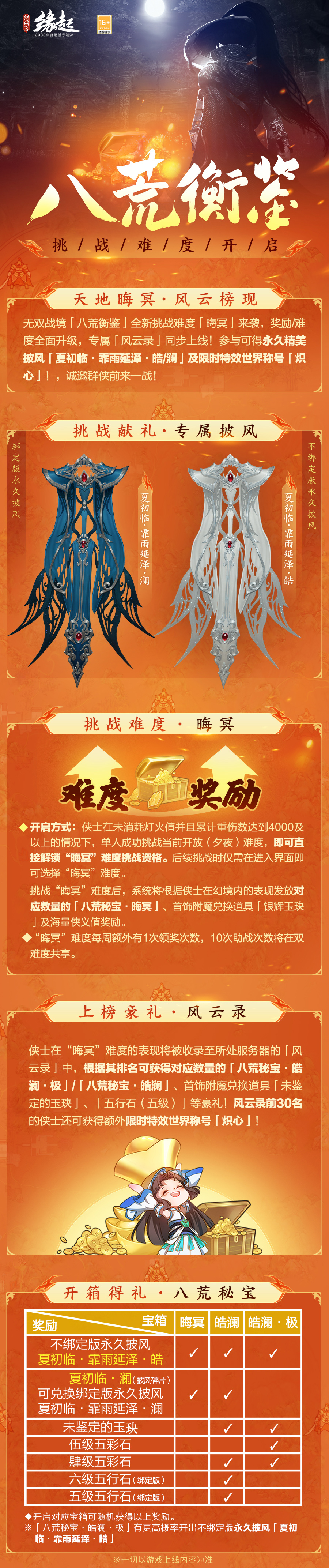 晦冥幽幽,侠者横刀,皓然斩重昏,天地换。《剑网3缘起》X《镖人》联动定档12月22日!八荒衡鉴挑战难度、奖励全面升级,参与送珍贵永久披风。更有精彩联动玩法将上线,敬请期待! 【朔风惊大漠 刀马纵八荒】 朔风卷地扰黄沙,镖客惊现纵八荒。《剑网3缘起》×经典硬派武侠漫画《镖人》12月22日联动定档,燃冬而来!当神秘的荒漠镖客与大唐侠士破壁相遇,又将开启怎样的际遇.....朔风惊大漠,刀马纵八荒,且邀诸侠共探这风云莫测之局! 【天地晦冥生 炽心书风云】 八荒衡鉴挑战难度“晦冥”开放,奖励全面升级,参与拿高价值永久披风。专属“风云录”同步上线,上榜可获得【八荒秘宝·皓澜】、限时特效世界称号【炽心】、永久精美披风【夏初临·霏雨延泽·皓/澜】等豪礼。更有《镖人》联动玩法将启,感兴趣的侠士切莫错过! 《剑网3缘起》“剑湖神宫”火爆公测中,免费畅玩!江湖情势瞬息万变,燃冬一斩快意恩仇。玩法更新奖励升级,八荒浓墨再添重彩。欢迎各位侠士重游故地,平行世界破壁相会,追寻昔日江湖情! 更多《剑网3缘起》相关资讯,可以关注叶子猪的《剑网3缘起》官方合作专区 编辑:寒冰雪龙