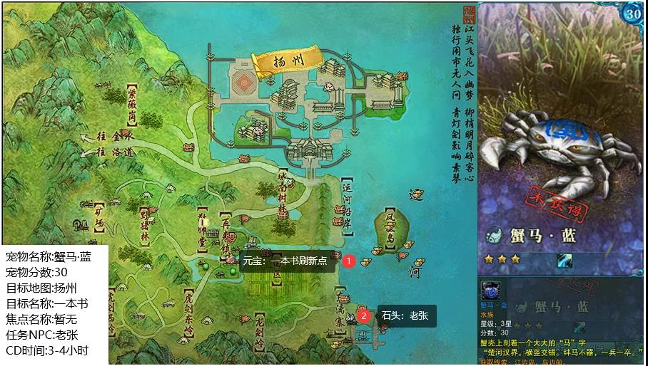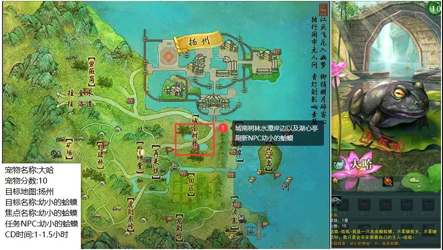 刷新点是围着城南树林的池塘一圈,包括湖中亭子旁也刷新。CD时间1~1.5小时,不需要驯养。又被戏称为扬州之光,可焦点“幼小的蛤蟆”。