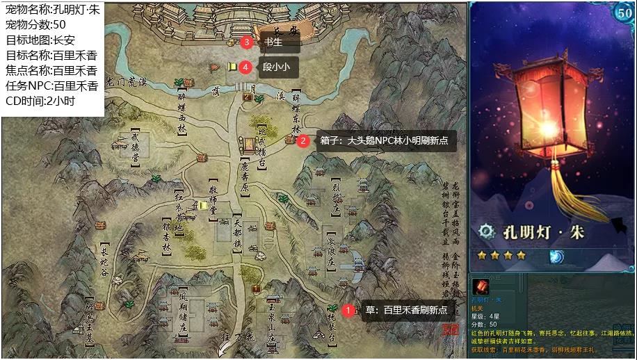 小草点一共6个刷新点,2小时刷新一次,可添加焦点“百里禾香”。和百里禾香对话接取任务“此物寄情最相思”。再去长安城里找书生做后续任务,完成后续找主城茶馆的百里禾香交任务获得孔明灯·朱。