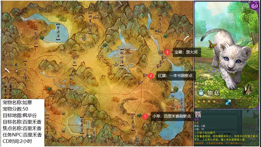 红旗点刷新任务品“一本书”,CD时间1~2小时。拾取进包后变成《象棋谱·半仙局上部》,平顶村桥头找楚大河完成任务获得幼崽,需要驯养。