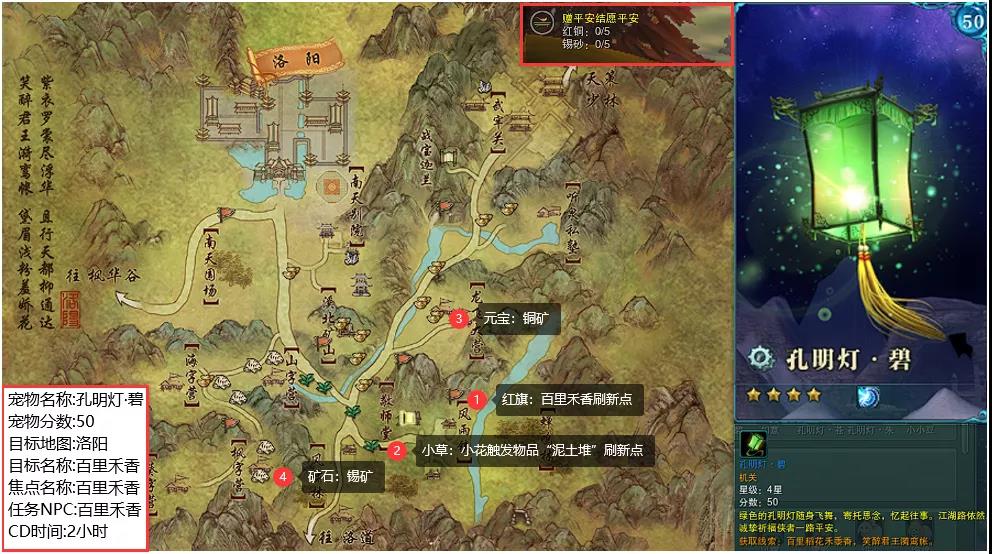 红旗点一共6个刷新点,2小时刷新一次,可添加焦点“百里禾香”。和百里禾香对话接取任务“赠平安结愿平安”。再去洛阳城里找慕容追风做后续任务,完成后续找主城茶馆的百里禾香交任务获得孔明灯·碧。