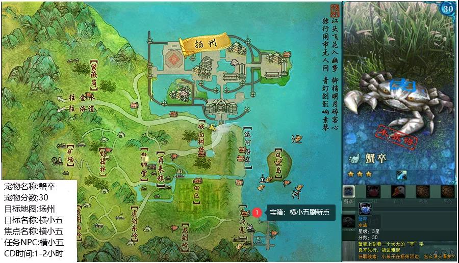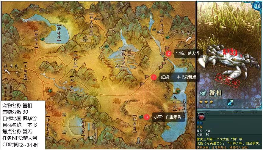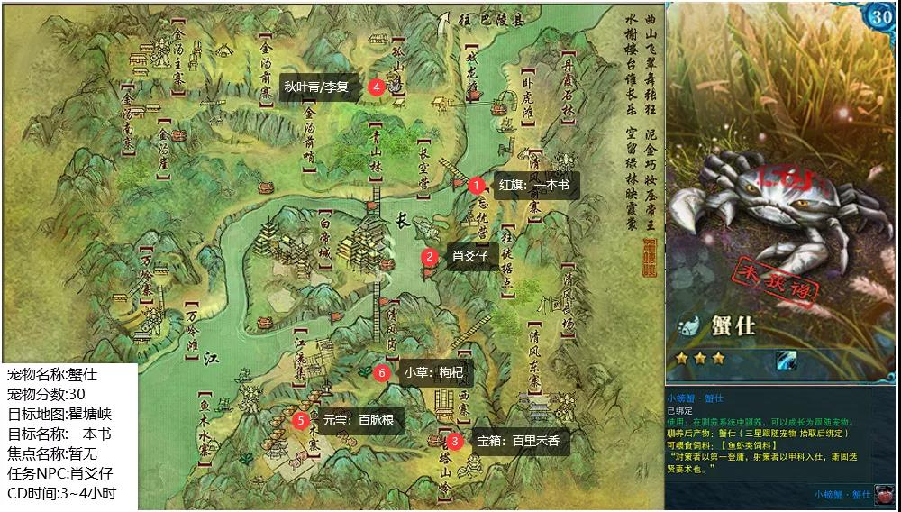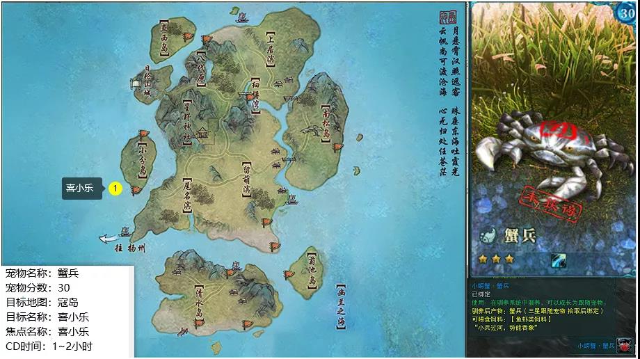 红旗位置刷新NPC喜小乐,CD时间1~2小时。对话完成任务可获得蟹兵幼崽,需驯养。