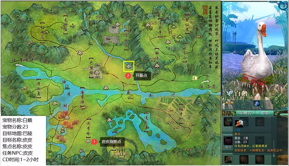 假山位置刷新NPC皮皮,CD时间1~2小时,开服点在左丘园下面。找到皮皮后,对话获得白鹅幼崽,需驯养。