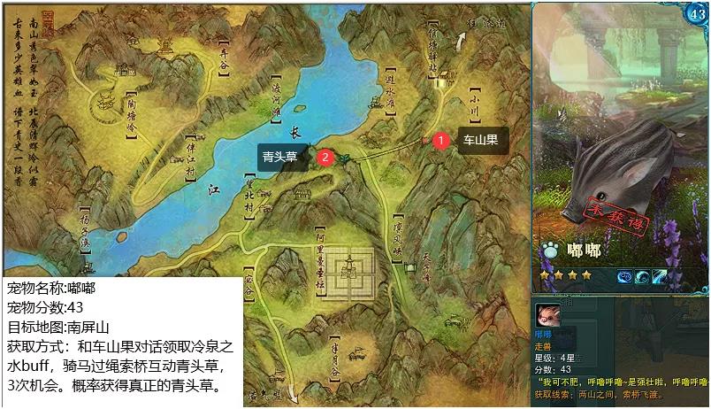 蓝色涂色区域随机刷新NPC“果子狸”,CD1~1·5小时。可焦点“果子狸”。与果子狸对话获得宠物稻稻,无需驯养。