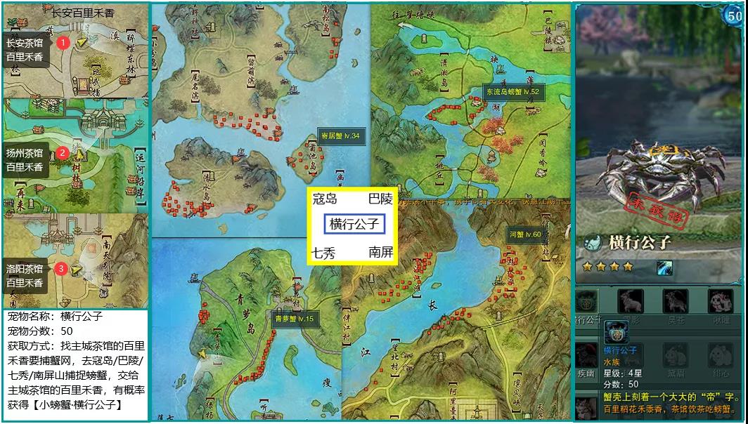 在主城茶馆附近的百里禾香处领取3个【捕蟹网】,然后前往至巴陵县潇湘岛、南屏山避水滩、寇岛清水岛岸边、七秀坊青萝岛岸边捕捉任意螃蟹,将捕捉到的【鲜活的螃蟹】上交给百里禾香后,有概率激活"奇遇”任务【横行公子】,完成任务可获得奖励:螃蟹宠物—横行公子。