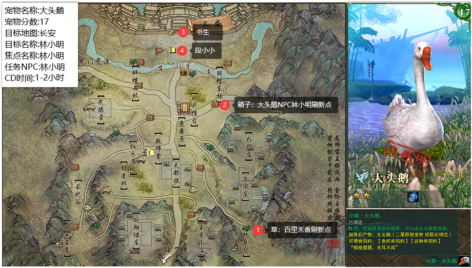 宝箱点刷新NPC林小明,目前已知6个刷新点,可以添加焦点“林小明”,CD时间2~3小时。找到后对话林小明完成后续,到长安世界车夫点找段小小交任务获得大头鹅。