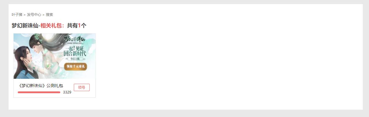 梦幻新诛仙礼包码怎么获得?梦幻新诛仙礼包码怎么领?相信很多玩家都不是很清楚。今天我来给大家介绍一下。 《梦幻新诛仙》是完美世界游戏研发并自主发行的全新旗舰级新诛仙系列手游,官网已正式上线 。喜欢梦幻诛仙系列的朋友们速来新梦诛进行体验。 如果你想获得梦幻新诛仙礼包码的话,可以登录叶子猪礼包中心来获取。具体操作方式如下: 1、登录叶子猪礼包中心,点击前往>> 2、在右上角的搜索框里,搜索“梦幻新诛仙”。 3、这个时候就可以搜索出梦想新大陆的专属礼包了。 目前只有一个礼包,各位可以先上去看看,后面我们也会继续补充的。 最后说一下,叶子猪礼包中心会经常发布一些游戏的礼包,建议各位先保存,时不时的来看看,或许有你喜欢的游戏礼包呢。 编辑:大主顾