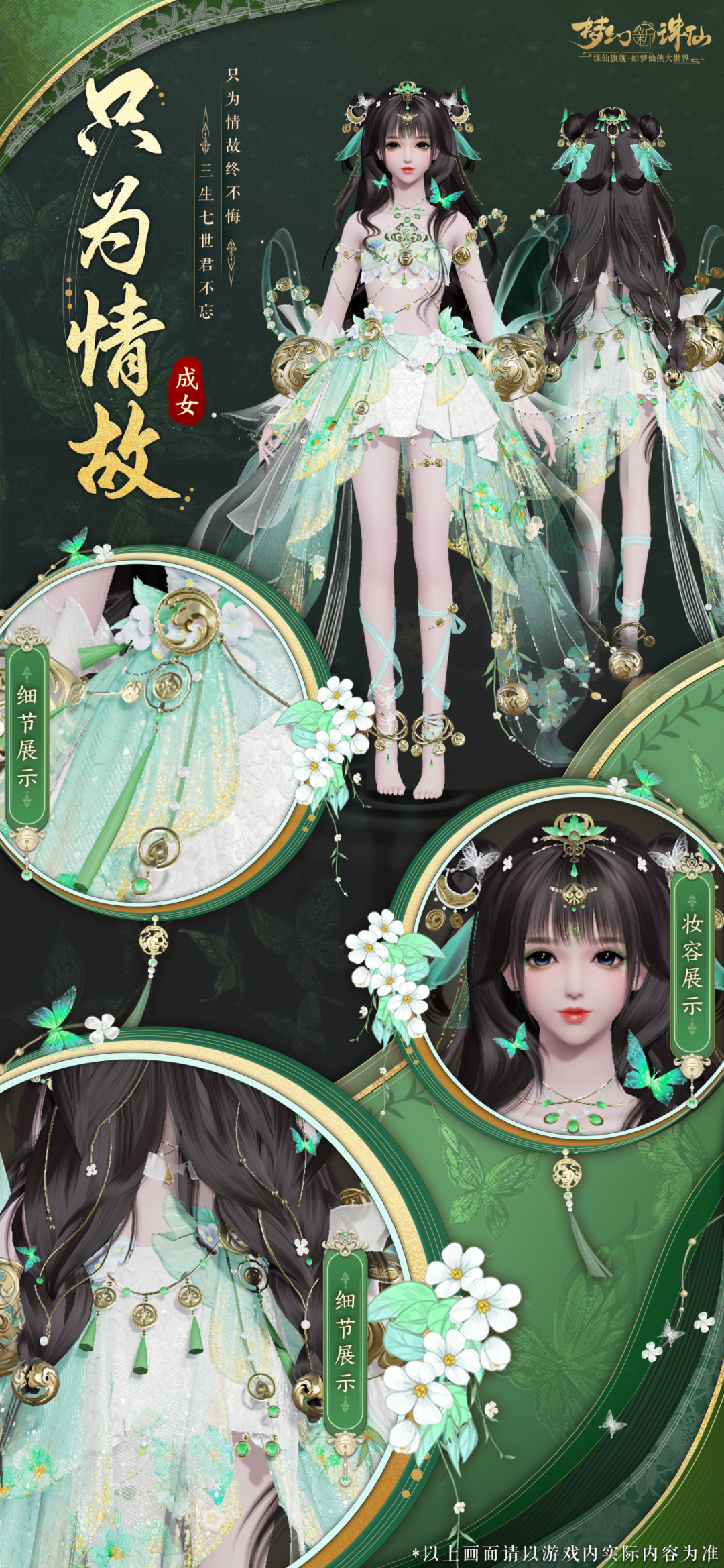 道友们好呀~ 寒露洁秋空,遥山纷在瞩。 今日是寒露节气,它的到来,也标志着深秋的开始。 在神州浩土如何度过一个丰盈的金秋?让我们先从一套全新时装开始吧! *开发中画面,不代表最终游戏实装品质 全新金秋时装·只为情故,女装轻盈飘逸,男装沉稳内敛,展现了东方古典美的独特韵味与美丽。 “只为情故”,受《诛仙》中合欢铃与噬魂棍两大武器的拟人化灵感启迪,金秋重阳之际,精心重现那段绝美非凡的故事篇章,将爱情与相思完美融合,让感动与温暖永存。 时装·只为情故 三生七世君不忘,只为情故终不悔。 故梦重寻 重阳之日,青云后山秋风萧瑟,枫叶如火。 不经意间,发现噬魂棍旁挂着的精致饰物,它轻轻摇曳,铃声清脆,似是合欢铃再现眼前,唤醒了鬼厉心中深藏的记忆。 霎时间,手中的合欢铃突然铃声大作,光芒四射,幻化成碧瑶的身影,如梦如幻。 成女时装展示 长发披肩而下,发间的蝴蝶更添一份灵动。合欢铃清脆作响,讲述了一段动人的故事。裙身以细腻的丝绸织就一抹清新的绿色,轻盈飘逸,金色的花纹若隐若现,如同阳光下的光影。似是仙子下凡,不失细腻与柔美。 成男时装展示 以独特的红色和黑色为主色调,营造出一种神秘而强大的氛围。长袍以深红色为主,如同夜色中的火焰,既炽热又充满力量。黑色的盔甲,如同深渊中的暗流,为整体增添了一抹沉稳与内敛。不仅体现出刚毅与果敢,更暗含了对爱情的深沉与执着。 少女时装展示 绿色和白色交织,给人一种清新自然的感觉,裙摆随着步伐轻轻摆动,如同水面上荡起的涟漪,优雅而迷人。点缀的伤心花和蝴蝶,更是将甜美与可爱展现得淋漓尽致。金色的合欢铃轻轻摇曳,发出悦耳的声音,为整体造型更添动感与活力。 少男时装展示 深红色的火焰纹样在黑色的绸缎上跃动,仿佛随时都会燃烧起来,带来无尽的热情与活力。而腰间金色的细节则如同点睛之笔,增添了几分高贵与奢华。设计复杂而精细,每一处细节都透露着匠人的用心,整体既充满了力量感,又不失细节之美。 幻影重逢 碧瑶幻化成一抹碧色倩影,仿佛从记忆中走出,带着一抹不可触及的温柔。此刻,噬魂棍也化作一道黑色人影,与碧瑶遥相呼应。 两个神兵聚集灵气,似乎有着某种神秘的联系,共同编织着一个只属于他们的结界。 幻影如烟,唯余铃声回荡,合欢铃和噬魂棍静默相对,满是无尽思念。 原色效果一览 染色效果抢先看 染色色号参考: 成女粉白 头: #E5D9C6 #C5C5C5 #808080 衣: #FF71A4 #615868 #FFFFFF #FFFFFF #9B9B9B #FFFFFF 成女黑白 头: #FFFFFFF #EDEDED #000000 衣: #000000 #FFFFFF #000000 #FFFFFF #FFFFFF #FFFFFF 成男蓝白 头: #9095D4 #AEAEAE #9FAAB4 衣: #C5C5C5 #8A94AF #FFFFFF #9FA6B9 #FFFFFF #B0B0B0 成男黑紫白 头: #FFFFFF #939393 #97C9FF 衣: #000B5D #FFFFFF #818181 #5A4B64 #62647D #545454 少女黑绿 头: #FFFFFF #121B1B #111B1F 衣: #030606 #000000 #000000 #0D1212 #090A0A #0C0D0F 少女红白 头: #E6CFCF #EEEEEE #FFFFFF 衣: #390000 #FFFFFF #FFFFFF #270410 #999999 #A6A6A6 少男蓝黑 头: #DADCF7 #444159 #939393 衣: #000000 #37334B #464659 #000000 #33313C #000000 少男白灰 头: #FFFFFF #FFFFFF #71798A 衣: #232225 #FFFFFF #85838C #E3E2E2 #2F2E31 #CDCDCD 妆容展示 梦回往昔 歌声回荡在山谷间,每一个音符都承载着无尽的思念与眷恋。 两个身影逐渐变得模糊,最终消散于无形,只留下噬魂棍与合欢铃静静地躺在原地,见证了一场无法触及的梦回往昔。他和她,终究只能活在彼此的记忆里,于重阳之日,共赴一场思念之旅。 背饰展示 背饰·噬魂棍 金铃清脆嗜血误,一生总被痴情诉。 背饰·合欢铃 金铃清脆嗜血误,一生总被痴情诉。 飞剑展示 飞剑·清铃音 铃铛咽,百花凋,人影渐瘦鬓如霜。 寒露 今天的霓裳分享就到这里结束啦!是谁迫不及待要在神州浩土cos一段相思爱恋了~ 更多官方动态,请继续锁定叶子猪《梦幻新诛仙》官方合作专区。 编辑:叶子猪小秘书