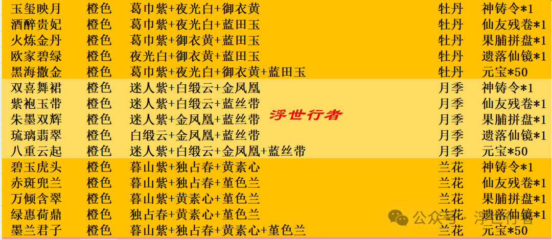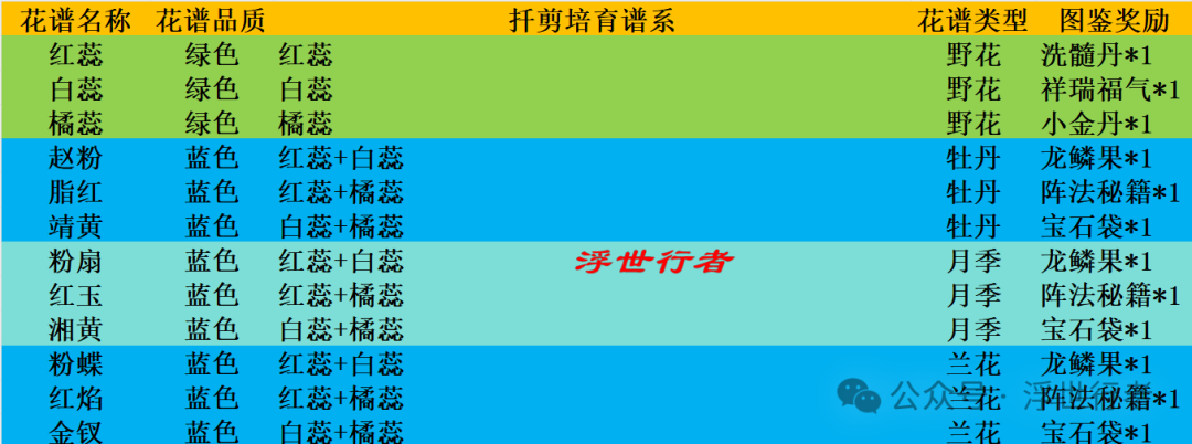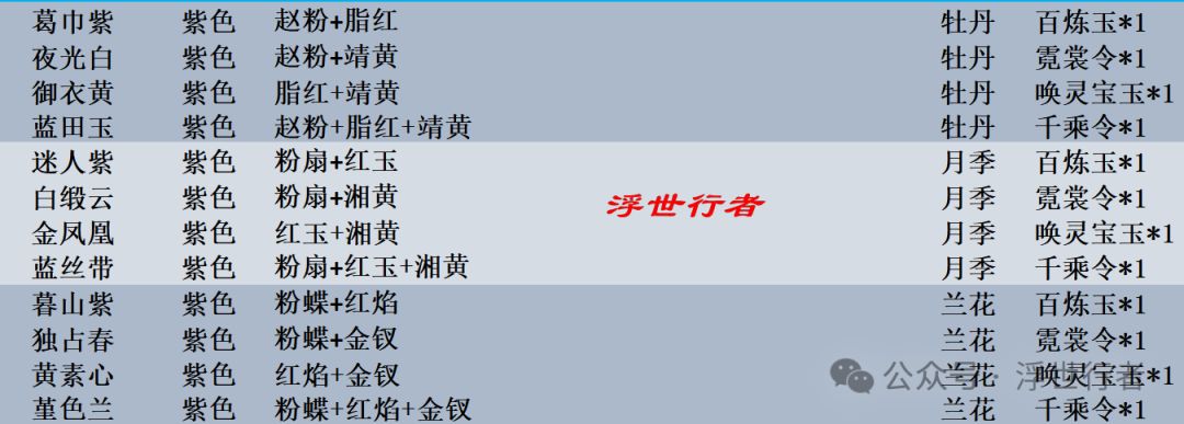 本周梦幻新诛仙维护更新后,全新的「繁花争艳」玩法就正式上线了,这个玩法可以通过让你种花获取元宝、神铸令、百炼玉、唤灵宝玉等各种福利,并且你还能去偷你好友花房里的花,可以说又是一个“提升”情感的绝妙玩法,今天就让攻略大佬“浮世行者”带你如何和玩种花和怎么性价比最高的偷好友花田。 配方图鉴(扦剪培育谱系): 绿色品质: 赵粉:红蕊+白蕊。 脂红:红蕊+橘蕊。 靖黄:白蕊+橘蕊。 粉扇:红蕊+白蕊。 红玉:红蕊+橘蕊。 湘黄:白蕊+橘蕊。 粉蝶:红蕊+白蕊。 红焰:红蕊+橘蕊。 金钗:白蕊+橘蕊。 紫色品质: 葛巾紫:赵粉+脂红。 夜光白:赵粉+靖黄。 御衣黄:脂红+靖黄。 蓝田玉:赵粉+脂红+靖黄。 迷人紫:粉扇+红玉。 白缎云:粉扇+湘黄。 金凤凰:红玉+湘黄。 蓝丝带:粉扇+红玉+湘黄。 暮山紫:粉蝶+红焰。 独占春:粉蝶+金钗。 黄素心:红焰+金钗。 堇色兰:粉蝶+红焰+金钗。 橙色品质: 玉玺映月:葛巾紫+夜光白+御衣黄。 酒醉贵妃:葛巾紫+夜光白+蓝田玉。 火炼金丹:葛巾紫+御衣黄+蓝田玉。 欧家碧绿:夜光白+御衣黄+蓝田玉。 黑海撒金:葛巾紫+夜光白+御衣黄+蓝田玉。 双喜舞裙:迷人紫+白缎云+金凤凰。 紫袍玉带:迷人紫+白缎云+蓝丝带。 朱墨双辉:迷人紫+金凤凰+蓝丝带。 琉璃翡翠:白缎云+金凤凰+蓝丝带。 八重云起:迷人紫+白缎云+金凤凰+蓝丝带。 碧玉虎头:暮山紫+独占春+黄素心。 赤斑兜兰:暮山紫+独占春+堇色兰。 万倾含翠:暮山紫+黄素心+堇色兰。 绿惠荷鼎:独占春+黄素心+堇色兰。 墨兰君子:暮山紫+独占春+黄素心+堇色兰。 橙色品质主要是靠规律总结出来的,如果大家发现哪里有问题的话及时知会行者修改,红色品质尚未收集完全等后续更新。 扦剪进阶方法: 首先找出自己想要解锁的图鉴配方,其次选择配方材料中数量最多的一种作为主材料,放在十字方格的中间,然后把其他需要的配方材料放到相邻的十字格内即可。如果不需要5种材料,那么只要在相邻的四个格子内随便选择需要的格子即可,为了防止冲突,其他格子可以不种花卉或者种不同品质的花卉。 如果所有材料花卉一起成熟的话,为了防止冲突培育出其他非需求花卉或者损耗掉数量少的副材料,一定不要一键采摘扦剪,先把摆放在中间的主材料花卉采摘扦剪,如果成功培育出需求高品质花卉的话,再将其他副材料一键收割扦剪。 好友花田: 新增好友花田功能,可以进行采摘照料。 采摘偷花: 可以点击好友花田参与偷花或者种花,偷花可以获得花卉(不影响好友产出,每个好友每朵花成熟只能被偷一次),偷取的花朵可以解锁图鉴(但是不能获得花苗),每天只可以偷3次,建议优先偷取自己没有解锁图鉴的高品质花卉。 辅助照料: 在好友花田进行照料不限制次数,每次照料有概率产出随机基础花苗,该奖励每日仅可获得1次。概率属实有点低,有时间的小伙伴每天可以多刷一阵,刷到奖励之后就别浪费时间了。 更多游戏攻略,请锁定叶子猪《梦幻新诛仙》官方合作专区。 编辑:叶子猪小秘书