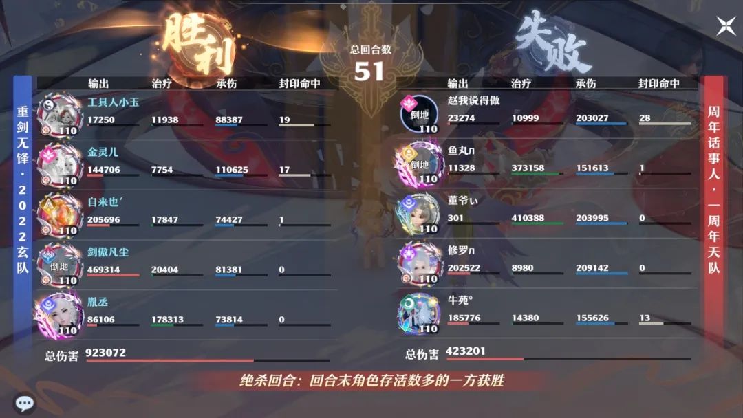 历经两日鏖战,《梦幻新诛仙》第39届天命之战已决出冠军,完美落幕! 冠亚季军战队 恭喜来自<2022>的【重剑无锋】战队,强者无敌勇夺冠军! 恭喜来自<一周年>的【周年话事人】战队,鏖战群雄坐拥亚军! 恭喜来自<太极玄清>的【玛卡巴卡】战队,战意激荡斩获季军! 下面咱们就来看看总决赛的精彩瞬间吧! 作者:@仙闻攻略组 - 隔壁村的老喵? 注:大神攻略非官方建议,仅供道友参考哦~ 总决赛:重剑无锋 胜 周年话事人 阵容配置 观战方:<2022>重剑无锋 【阵容】:鬼道+天道+合欢+长生+南疆 【初始阵法】:龙飞阵 【初始灵兽】:4只玄猫刺客+海嘟嘟 对战方:<一周年>周年话事人 【阵容】:龙族+万毒+合欢+天音+南疆 【初始阵法】:云垂阵 【初始灵兽】:4只麒麟剑客+海嘟嘟 总决赛简报 本场决赛的观战方是鬼道+天道的国标双封队,持续清宠能力较强且有强力单杀手段。 对战方则是龙族+万毒的绝杀双奶队,核心战术是持续守阵拖到绝杀回合,然后全力输出一波结束。 本场比赛确实打到了绝杀,但令人意外的是观战方最后打出了几波究极帅气堪称模范的进攻,大家一起来看看是怎么回事吧! 前期阶段,观战方在第2波灵兽召唤中选择了“击破+驱鬼”的麒麟剑客,专门用来针对对战方的鬼道防御肉宠,取得的成效还是不错的。因此在后续他们还选择了召唤驱鬼单法和镇魂单法,如阎王敌、千面妖姬和海嘟嘟。 可惜对战方在清宠方面的经验更老到,他们通过特技“断刃术”和“失心术”对观战方的输出持续降攻,而且他们的龙族会在关键回合吹“疾风破”控输出。 合欢也不是学的繁花,走的落英多封路线只求控人。并且在法宝方面对战方会更多地使用控妖笛抓灵兽,这就让观战方很难打输出。 不过观战方也有对策,既然缺输出,那他们就不召配速了,一直拉输出猛猛跟对战方换血。对战方也召唤了一群全肉海嘟嘟就是站场,不让你清得这么轻松。 此时我们也能发现对战方天音的速度在合欢之后,合欢打完伤害一下就被奶回来了。而且龙族的速度在天道之前,一吹就控也是很难打伤害。 第41回合,观战方放手一搏,天道用狼烟带动鬼道魂灭,配合力合欢的比翼助攻一波拿下对战方万毒。 此后他们一路高歌,利用好每一个技能每一种状态,最后时刻还召唤出暴龙大队,在有组织有纪律的连环进攻下,于绝杀回合将对战方击败,含金量拉满。 下面我们就再细看一下观战方最后几波的帅气操作吧! 黎明前的号角,绝杀前的突破 第40回合,对战方场上单位不多,观战方抓住机会发起进攻,可惜天道被吹起,击杀没能成功。但这应该是绝杀前最后的机会了,于是观战方决定放手一搏,连续对万毒发起进攻。 第41回合,对战方万毒防御,双奶直接把血量奶满,本以为无望突破。但对战方没有去解伤心花,也是大意了。这时观战方合欢丢出降防神火罩,天道使出狼烟带动鬼道出手,这一招魂灭+结算还连着带动了合欢比翼,直接清空了万毒的血条。 ▲画质严重压缩,游戏内体验更佳 天道狼烟的戳刺还刚好下滑到了龙族,为队伍又打开了突破口。紧接着鬼道又触发了剑引,那真是不得不展现神威,表演一波双索魂炸场一穿二了。 ▲画质严重压缩,游戏内体验更佳 偃甲龙,出击! 第48回合,观战方直接召唤5只偃甲龙/暴龙兽,准备清场。 对战方龙族和万毒都只能单清,并不像鬼道那样离魂可以挂多个单位,所以在己方没有输出灵兽帮助清宠的情况下,打对方的脆皮输出灵兽就会很吃亏,哪怕进攻全都打出来一波也就杀两个,而且偃甲龙/暴龙兽有被动也不会亏输出。 诛仙诀三封? 我的诛仙诀能全数返还! 第49回合,对战方合欢诛仙诀封印3只偃甲龙/暴龙兽,还跳出了蛇阵把万毒换到了法防位,想抵抗鬼道的输出。但是观战方用鬼宿牙封了合欢的防御法宝,仅凭两只偃甲龙/暴龙兽和鬼道离魂就将合欢击杀。 第50回合,观战方长生超级帅气的“诛仙·逆”转走了所有的伤心花,对战方龙族的无敌逆鳞被破,合欢、天音、万毒全部被封。 ▲画质严重压缩,游戏内体验更佳 而且就因为对战方跳了蛇阵,为观战方天道的操作创造了空间。不知道大家是否还记得,天道的高能增幅诛仙诀是能够击退人物单位的(对方身后有位置的情况下),这一下直接就把对战方的阵法打没了。 ▲画质严重压缩,游戏内体验更佳 魂灭连拍,击碎绝杀梦 5只暴龙齐出手,对战方难以抵抗。而且观战方还跳成了鸟阵,速度非常快。第51回合观战方5个人全部出手了,对战方还一个都动不了。 只见天道再次使用狼烟摇旗,带动剑引鬼道,魂灭首拍击倒天音,法连下滑刚好守尸残血万毒,这一波帅气的连杀断绝了对战方翻盘的希望。 ▲画质严重压缩,游戏内体验更佳 让我们恭喜【重剑无锋】战队,获得了第39届天命之战的冠军! 嘿嘿,天命之战的决赛速报就到此结束~ 编辑:月光下完美