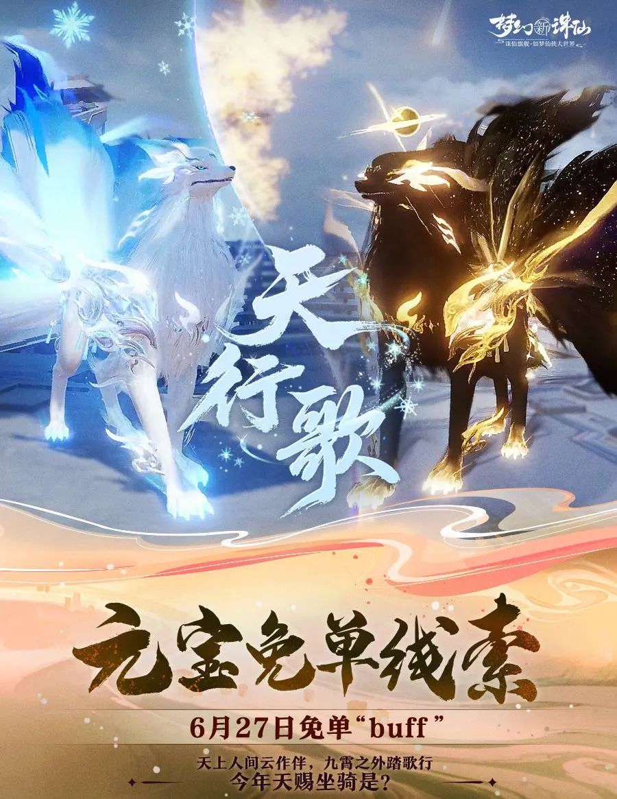 致神州道友: 为给诸位仙盟道友带来更好的游戏体验,《梦幻新诛仙》于6月26日7:00-8:00进行例行维护,本次更新公告详情如下: --·【更新公告速览】·-- 1.【新增内容】 2.【霸气星期五】 3.【优化及修复内容】 *最终更新内容请以游戏实际体验为准。 【新增内容】 天赐坐骑,全新登场 登场时间:6月26日维护后 全新天赐坐骑·天行歌登场,以神话狐狸为原型设计,浑身覆盖纯净白毛,清冷锋芒,点缀冰蓝特效纹路,流转幽蓝辉光。其幻化形态·天不孤,周身星云旋转,骑乘其上,以孤影为舟,载着整片星海的磅礴,行走于星云之间。 不光颜值绝美、腾云驾雾,还能呼风唤雨、赐福神州! - 「坐骑技能」 坐骑技能[天行歌]:天狐乘风,骑乘后移动速度增快,可腾空飞行且不消耗真气。解锁坐骑后可获得天行歌专属头像框、气泡框、名片、称谓等奖励。 特殊能力[天赐福泽]:解锁幻化形态·天不孤后获得,使用可令当前世界场景的天气转变为暴雨天,并召唤自身虚影赐下福气。 - 「坐骑获取方式」 获得90个天赐精魂后,道友可前往河阳城天赐使者处接取天赐任务,完成任务后即可获得坐骑·天行歌!还附赠头像框、气泡、名片、酷炫称谓等奖励~ 想更霸气?再攒60个精魂,即可解锁进阶幻化形态·天不孤! - 「精魂获取方式」 天机排位:每日首胜宝箱,可获得[天赐魂匣]。 跨服交易:可上架非绑定的[天赐魂匣],自由售卖或购买。 商城直购:元宝商城金锭可直购[天赐灵枢],每个售价160金锭。 坐骑寻访:获取到[天赐魂匣]与[天赐灵枢]后,前往「寻机缘」活动页面「天赐仙骑」进行寻访概率获得[天赐精魂],每20抽保底必得! 注:使用天赐灵枢开启天赐魂匣,开启必得3个小金丹,并额外免费获得一份奖励,奖励可能为天赐精魂、灵武星石、6480元宝等。 【霸气星期五】 本周霸气星期五免单来袭: 活动时间:6月27日 据说近期神州浩土有件大事:万灵宫小白召唤了一只九尾灵狐,其形殊异,化而为骑,皎洁如月。传说此狐乃上古祥瑞,能控制天气,它尾巴一摇,就能呼风唤雨,福泽一方苍生。本周霸气星期五活动线索来袭,谜底与天赐坐骑有关~ 【优化及修复内容】 1. 大漠狐冢优化:调整了非战斗状态下气血条和状态栏的位置。 2. 修复了仙友许愿池中缺少个别红色仙友的问题。 3. 修复了觉醒命格无法增加指引系统中灵兽评分的异常。 编辑:月光下完美