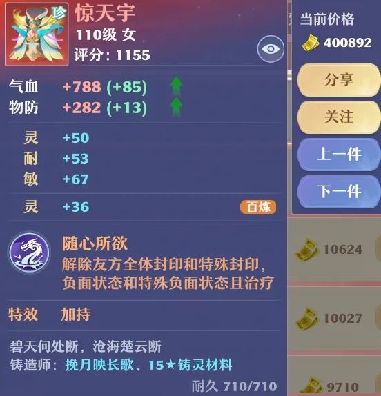 道友速看!随着战斗强者的神装与铸造大师的杰作现世,全服交易行成交量飙升,金券流通量创历史新高! 什么,你问什么是金券? “自在交易”系统现已全服开放,大伙买装备都用金券。珍品装备卖出的金券到手后,道友还能自由选择继续投入交易行买更好的装备,或换元宝抽坐骑,或购入百炼玉等稀有材料…… 金券的高流通性,是“自在交易”的基石,让每位道友尽享游戏乐趣! 今天,小梦就带大家来看看,最近神州浩土又有哪些神装出现吧~ 顶级三特,成就百万富翁 By:铸造大师-悦刻老板° 小梦回复 这位铸造师真是发大财啦!基础和双加数值较高,百炼数值及格,在此之上建立的三特必是神装。 禁锢、成长,封印大佬要的就是这个组合。而且从PVP的角度来看,这件装备有成长去提升宝石,百炼还是加耐,防御值很高,清心术也是专门为保证C位出手而准备,真是相当有说法。 戴上这件三特头,封得准来身板硬,有怒C位便安心~ 感受一下顶级加持的魅力 By:铸造大师-挽月映长歌 小梦回复 要问数值哪家强,来找加持百炼装! 这一件装备的属性点就加了206点,超越别的神装一件半,对比普通装备翻一番。若集齐一套,效果堪比多穿六件装备。再有顶级大特技随心所欲,说这上衣是金甲仙兵身上扒下来的也不过于此了。 灵灵灵,全是灵 By:铸造大师-南风知意丶 小梦回复 灵慧,正负灵,百炼灵,确实很灵了! 能卖出10万金券可能是大佬急需,也可能是真的够灵。毕竟一件装备就能加134的灵点,这怕是上哪都不好找哦。而且特技也刚刚好是法术输出功能技,一巴掌给敌人拍死还能复活队友,关键时候能不能立功真就看这一下了! 兄弟,何不再来一把十万的扇子 By:铸造大师-剑舞い 小梦回复 这件焚香武器也是相当不错,属性洗一洗就是+112的灵点,祝福的法攻也是接近满值,法攻这块真就是大哥,不怪百炼是力也能拍上10万。 而且就算是百炼力,39的数值够高啊,跟加20灵的百炼也差不多了。况且还有特技,能洗就有无限可能。更别说以后想玩万剑青云,直接无缝转移,爽玩力灵武器~ 百炼灵和崩山击,这组合也能三万? By:铸造大师-叶落 小梦回复 能的道友能的!刚就说过的万剑青云,虽然可继续走灵也能玩力,但特技这一块还是要玩物理才能触发追击被动。所以说尽管适用范围有限,但这件装备因其特殊的针对性而价值不菲,拍到三万并不出奇。 物理门派的梦中情头! By:铸造大师-万兔岁佛 小梦回复 猛击成长三特头是什么概念?曾经有类似的一件装备出世,拍出十几万金那都叫保底。更何况如今是水火赛季,火神器的暴击让每位输出都想要一顶猛击头,听说已经有大佬出价21w带走了! 猛击作为输出门派的关键特效,成长更是能进一步提升头饰位金刚石的物攻加成,能让物理大佬进一步突破输出极限! 锻造锤都抡冒烟啦,这双特效可还行? By:铸造大师-软语 小梦回复 这件双特可太行了!随着版本的不断变化,现在很多道友已经意识到“气血”的广泛适用性。在PVE中气血才是存活的关键,在PVP中同样也是不可或缺的一点。如今的亲和、减伤等各种防御类效果增多,高气血将会更有质量。而这件百炼体+体魄的饰品,说不定可以把你的血量提升至顶呢! 疾风?加持鞋不是更香! By:铸造大师-软语 小梦回复 百炼力的加持正负装,对于物理门派来说主打一个“全能”。想玩高速力敏,可以在拥有+130力的情况下再获得70敏,正常情况下不输疾风,更别说还有特技让你在战场上耍耍不一样的战术。如果想玩力耐,70敏一换,又是坦克流物理,能打能抗能辅助,是队伍的中流砥柱。正巧技改后耐万毒流派PK加强,这件装备可能相当合适哟~ 编辑:月光下完美