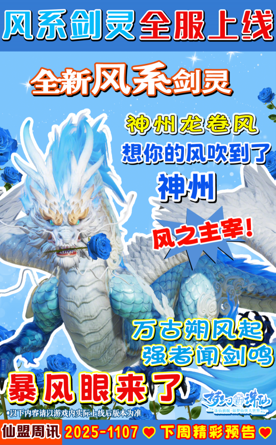 神州新鲜速递,下周精彩预告!道友们好,我是小梦,欢迎收看本期的《仙盟周讯》~ 小梦发现,最近不少道友的修仙进度条都有些“离谱”,因为有道友告诉小梦“第一次玩梦诛通宵了”!道友,梦诛虽好,可不要贪杯哟~嘿嘿,话是这样说,其实小梦也经常一玩起来就发狠了、忘情了…… 据小梦观察,有人连夜研究「止战之伐」排兵布阵,头发薅秃了也要争当战术大师;有人沉迷「傩面现」疯狂翻牌子,试图用玄学带走888元宝;更有人对着即将登场的朔风剑灵连夜补课~ 你也想挑战朔风剑灵?没问题!11月13日(维护后),朔风剑灵全服上线,全新挑战等你体验! *以下内容请以游戏内实际上线后版本为准 传说,天帝十二剑,万古朔风起,朔风剑灵镇守天帝剑冢,唯有强者可闻剑鸣。11月13日(维护后),朔风剑灵全服上线,静候诸位道友前来一试锋芒! 作为风的主宰,朔风剑灵可以说是“风系绝活哥”,因为它有一个特殊机制“暴风眼”。接下来,小梦就为你简单介绍一下朔风剑灵的特性~ 暴风眼 战斗开始在阵法2号位出现暴风眼。后续回合开始,暴风眼会按阵法站位2至8号的顺序传递。暴风眼会解除该位置怪物的封印、调息,且强化技能(具体道友可查看对阵界面攻略)。 御风 出手施放流风疾后获得1层御风。有风蚀的玩家方被其他怪击杀,也获得御风。 朔风陨 每3回合施放朔风陨:造成全体风系法术伤害,随机悬空2至4个有风蚀的目标;且可每消耗2层御风,额外施放一次朔风陨。 每存活1个其他怪物,剑灵受伤降低10%,最高50%。 这强度,说是这朔风剑灵是“龙卷风拆迁队”也不过分吧?不过别慌!有小梦在,你放心~以上是在先锋体验服中的信息,最终正式服外放的结果情况,小梦会持续为大家带来报道,敬请期待哟! 编辑:月光下完美