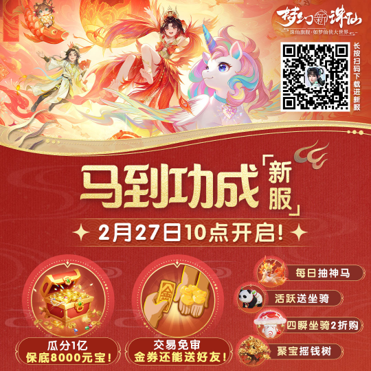 道友们好! 虽然假期余额归零了,但神州浩土的快乐才刚刚加满!元宵免审服<马到功成>即将开服,咱们不仅要过一个热热闹闹的元宵,还要让你体验一把“暴富”的感觉,在新年一切都“马到功成”! *以下内容请以游戏内实际上线后版本为准 元宵免审服<马到功成> 2月27日10点,正式开服 畅游海量精彩,瓜分一亿元宝,一起热闹过元宵! 现已开启预开服,抢先组队还有更多好礼! 元宵乐翻天,神州浩土闹不停! 好戏连台,玩法不重样! 元宵佳节至,小梦打听到,仙盟为道友们准备了不少惊喜玩法:探索寻宝、策略智斗……话不多说,赶紧来看看这个元宵,咱们能在神州浩土玩出什么新花样~ 策略升级,一战成名 「止战之伐」第二赛季已开启!新增百团大战、永夜挑战、福地奇遇三大玩法,策略、战力、机遇全方位升级,助你在新年一战成名! 逛纳福集市,淘奇珍异宝 马年到,那当然要在「马到功成」中探索地图,收集“新春福币”,前往“纳福集市”就能把各种奇珍异宝抱回家~ 邂逅奇遇,惊喜连连 神州还藏着许多秘密等你来探索!缘分这种事,谁说得准呢?道友们不妨前往「马跃新程」探索更多奇缘,反正小梦已经在满世界转悠了~ 更多惊喜即将登场 新法宝登场,法术反伤逆转乾坤 全新法宝·星轨仪即将在2月26日(维护后)上线,听说这宝贝拥有法术反伤的独特能力,能够在关键时刻以彼之道,还施彼身,助你在战场上一举逆转乾坤,等你前来体验! 锦衣华服,惊艳元宵 元宵佳节,月满灯明,除了夜色撩人,道友们的打扮更是惊艳如画,元宵时装·青玉元夕即将登场,带你瞬间梦回浪漫上元夜! 还有朱雀坐骑·涅离火、魅灵·灯灵、节日家具返场等惊喜现已登场,等你来一一邂逅,惊喜不停歇,快来共赴这场属于新春的浪漫盛宴吧! 新服福利享不停,享福快人一步 说了半天,你要问小梦去哪里能体验到这么多精彩内容?想入坑或者回归,到底去哪个服最划算? 别犹豫了,直接锁定元宵免审服<马到功成>!不仅能一站式体验所有元宵节的精彩内容,更有以下4大福利,主打一个“来了就是赚到”! 福利一:一亿元宝免费送, 人人有份! 元宵免审服<马到功成>开年就搞了个大新闻:1亿非绑元宝直接送! 开服后的前十天,所有进入<马到功成>的道友——无论新人、还是老友,均可参与“瓜分1亿元宝”活动!无需充值,只要完成任务积累积分,就有机会瓜分丰厚元宝奖励,不花钱也能瓜分元宝,回归老友福利加倍! ·新朋友:0氪也能畅快修仙!只需完成全部日常与活动任务,即可稳稳累积保底4000元宝! ·回归道友:?回归道友福利加码,起始积分上限提升至3500,开局即领先!历史付费越多,起步积分越高,瓜分进度快人一步!轻松完成任务,保底可瓜分 8000+元宝,回归即享巅峰福利! 小梦已经有看到道友晒出了自己分到元宝的截图,2月27日来<马到功成>,一起发发发! 图源:热心道友 活动时间有限,道友们速来参与!此外,还有山楂酥、瑶池圣果、命格自选宝匣等超多好礼等你带走~ 福利二:交易“0”门槛, 新服交易享特权! 自在交易2.0现已正式上线,谁说新服赚金难?在<马到功成>,自在交易2.0给你开了绿灯——新增两项专属福利:新服提金0限制,金券可赠送好友! ·新服提金0限制 <马到功成>开服后的30天内,道友取出暂存金券,不消耗仙望,没有上限! ·金券还能送好友 <马到功成>新增金券赠送功能,你可以消耗一定仙望,将金券赠予其他道友(会收取一定的金券手续费)。 小梦 若金券赠送功能对环境影响验证符合预期,我们未来将寻找合适时机全服开放此功能! 福利三:“保姆级”护航, 开局即巅峰 除了上面的惊喜,仙盟还准备了三大助力活动,助你新年启程一马当先! ①灵宠飞升令 完成灵宠飞升令对应任务,可轻松领取锻灵玉、洗髓丹、宝链、命格自选宝匣等灵兽养成豪礼!更有道具「造化神券」——使用后洗髓必出满技能灵兽!养成更轻松~ ②四瞬坐骑2折抽 道友可前往活动「神驹降临」参与寻宝,10发以内必出坐骑大奖!四瞬坐骑(菇行者、飙风雪、山中君、石敢当)2折带回家,还有天帝琼浆、千乘令等超多好礼同步放出~ ③唐三彩提前解锁 在<马到功成>,道友可通过「6元壕礼」活动提前解锁萌宠·唐三彩!陪你一起闯荡神州,又萌又能打! 福利四:预开服组队有礼 <马到功成>现在已经开启预开服,抢先组好固定队,就能赢专属头像框、自选称谓、气泡框、元宝和战队名片等好礼!预开服期间预充值任意金额礼包,即可解锁双重惊喜:额外的预充值礼包+预充值金额25%的元宝返利,最高可返利4860元宝! 本次更增设预充值宝袋!每充值30元可得1个宝袋,打开就有机会获得:随机坐骑、神兽神马、888元宝、1888元宝等惊喜奖励! 编辑:叶子猪小秘书