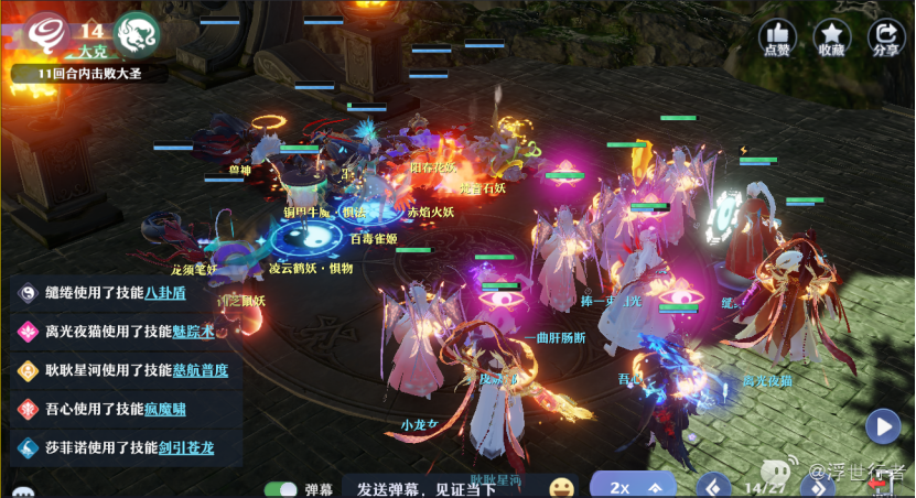 合欢根据战况选择封印,特技或者召唤,长生补充封印或者方寸老鼠,奶妈加血或者特技,物理门派加全部宝宝集火惧物鹤妖和其他输出单位,如果场上被封印目标超过4个法师就群秒,否则就单秒惧法牛魔。