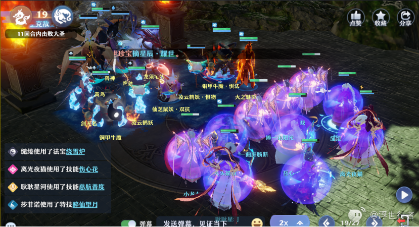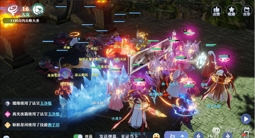 合欢和长生扔水法宝,分别以前排惧物鹤妖和火妖后面一格为中心,奶妈加buff,物理门派加宝宝秒掉残血怪物进四。