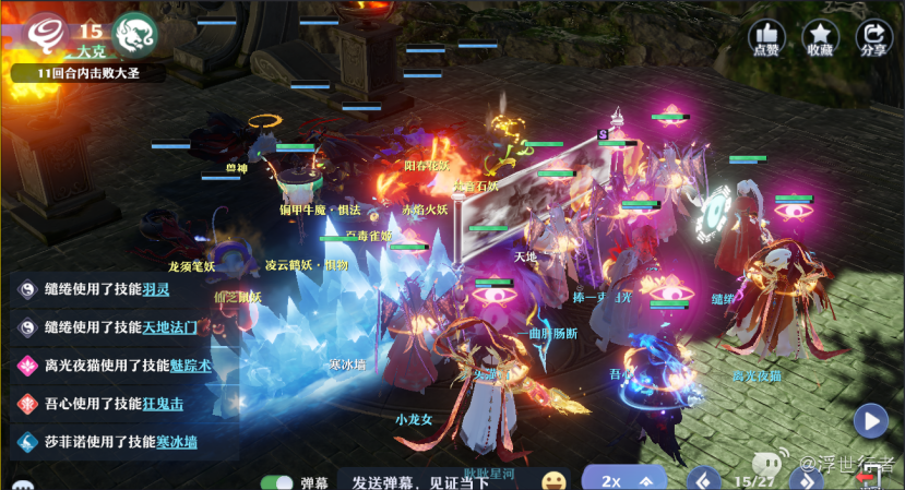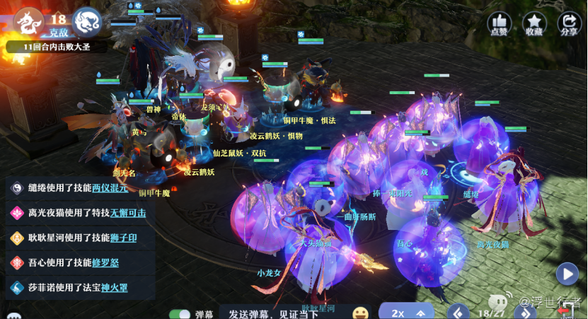 合欢封住右边惧法牛魔,长生方寸老鼠(被封的话可以帮奶妈扔法宝),奶妈以右边惧物鹤妖为中心丢冰法宝或者加血,输出单位全部集火黄鸟和惧物鹤妖,老鼠没方寸之前注意安排守尸。
