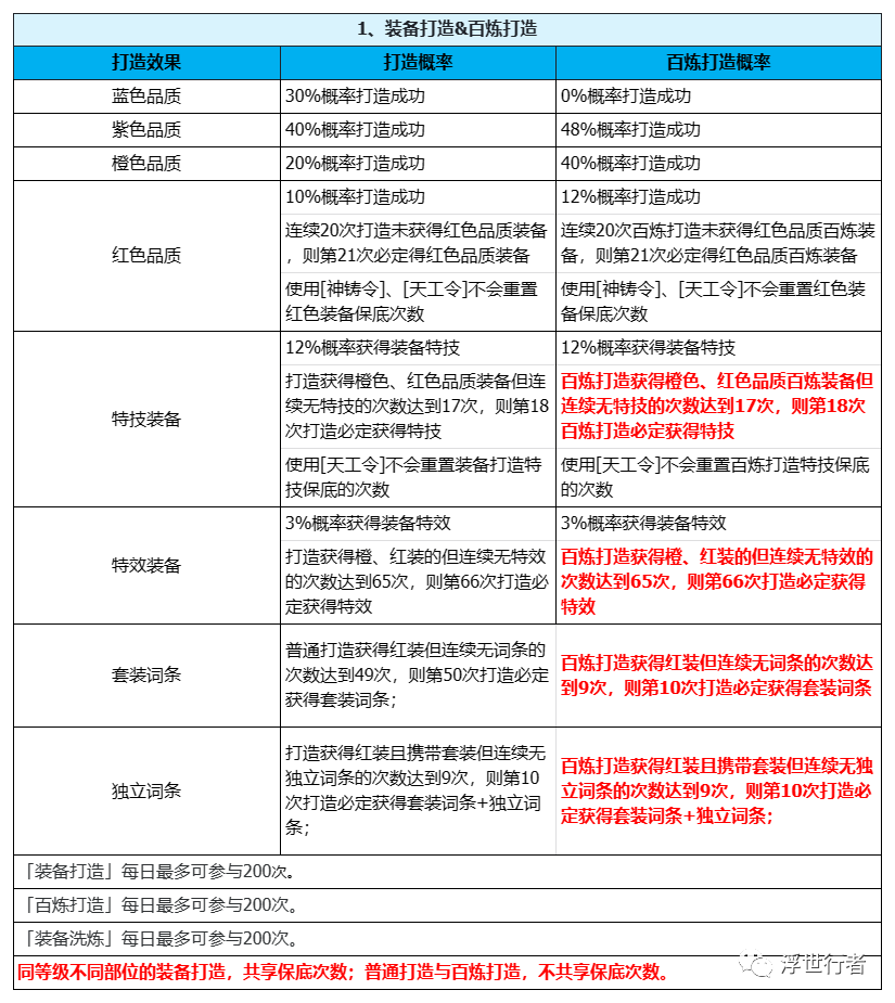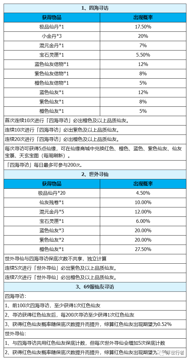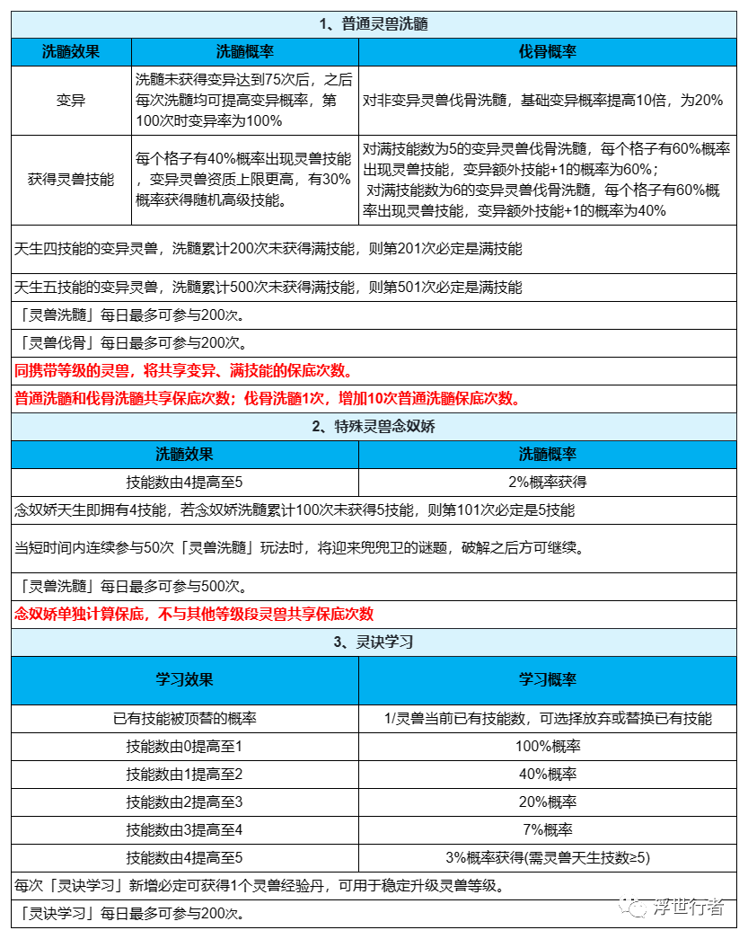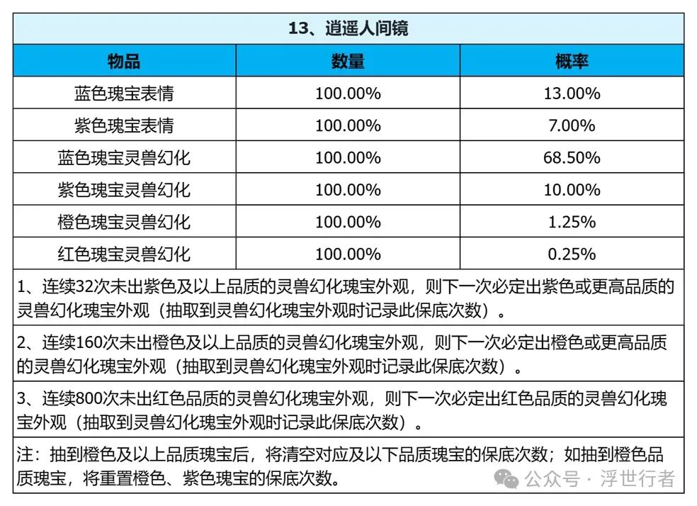 一起来看看各玩法的产出概率是多少以及保底次数。 装备打造: 打造/百炼打造出红色品质装备的概率是10%/12%,保底21次。 打造/百炼打造产出的橙色或红色装备携带特技的概率是12%,保底18次。 打造/百炼打造产出的橙色或红色装备携带特效的概率是3%,保底66次。 打造/百炼打造产出的红色装备携带套装词条的概率未知,保底50/10次。 打造/百炼打造产出的红色装备携带双词条的概率未知,保底10次(只计算携带套装词条但无独立词条的红装数量)。 同等级不同部位装备共享保底次数,普通打造和百炼打造不共享保底次数。 灵兽洗髓: 洗髓变异保底是100次(一次伐骨相当于10次)。 5技能满技能保底是201次(平均100次出),6技能满技能保底是501次(平均250次出)。 念奴娇满技能保底是101次(平均50次出)。 同携带等级的灵兽共享变异满技能的保底,普通洗髓和伐骨洗髓共享保底次数(伐骨1次增加10次洗髓保底次数)。 念奴娇单独计算保底次数。 宝链宝衣: 灵兽宝链获得时,有20%概率产出双技能,保底是10次。 灵兽宝衣获得时,有35%概率获得珍品属性,50%概率获得极品属性,15%概率获得绝品属性。 购买随机宝链/宝衣保底21次可以获得摇光宝链/宝衣。 灵装启灵: 启灵产出特效的概率是3%,单加概率是65%,正负概率是25%,双加概率是10%。 神兽结缘: 神兽结缘时本轮未兑换列表中的除联动下线神兽(比如大圣、吞噬鲲等)之外的其他神兽产出概率均等,想要拿到多只同种神兽,必须参与多轮结缘才有机会(或者使用指定结缘道具)。 仙友寻访: 四海寻访产出橙色仙友的概率是5%,保底是20次。世外寻仙产出橙色仙友的概率是27.5%,保底是7次。69服新增红色仙友的产出概率(四海期望0.52%,世外期望2.6%),保底是200次(四海和世外共享保底次数,世外增加5次保底次数)。 天玄宝图: 双倍奖励的概率是2.5%,满载而归的奖励是0.5%(平均200次寻宝出一次没保底),摇光宝链的保底是51次,寒烟雪残魂的保底是25次,产出整只寒烟雪坐骑的概率是0.1%(平均1000次寻宝出一次没保底,但是行者大小号加一起快两千次还没见到过)。 传世瑰宝: 红色品质的瑰宝武器外观/灵兽幻化/仙法道术/仙府家具产出概率是0.25%,保底是801次。 红色头发外观的产出概率是2%,保底是1001次,红色服装外观的产出概率是1%,保底是2001次,红色挂饰外观的产出概率是1%,保底是2001次。 橙色、红色瑰宝武器外观,出现印徽的概率为10%。 抽到橙色及以上品质瑰宝后,将清空对应及以下品质瑰宝的保底次数;如抽到橙色品质瑰宝,将重置橙色、紫色瑰宝的保底次数。 魅灵苏醒: 行者测试平均花费2700可以点亮全部区域,获得一只魅灵,产出的魅灵种类为未满星的魅灵均分概率(新魅灵上线时会开启活动增加概率)。 精英月卡: 霸气星期五免单: 从概率上来说充6元显然是稳赚不赔的买卖,328元券和648元券的产出概率极低,所以328和648档位建议优先选择福运满满(能一起享受到当然更好,欧皇随意)。 法宝血炼: 每种血炼属性的保底次数是25次(血炼时会轮流依次产出四种血炼属性)。 以上就是本期全部内容,更多游戏攻略,请锁定叶子猪《梦幻新诛仙》官方合作专区。 编辑:叶子猪小秘书