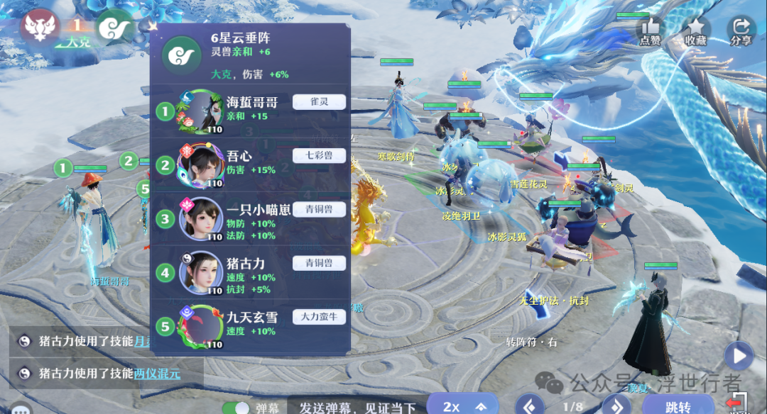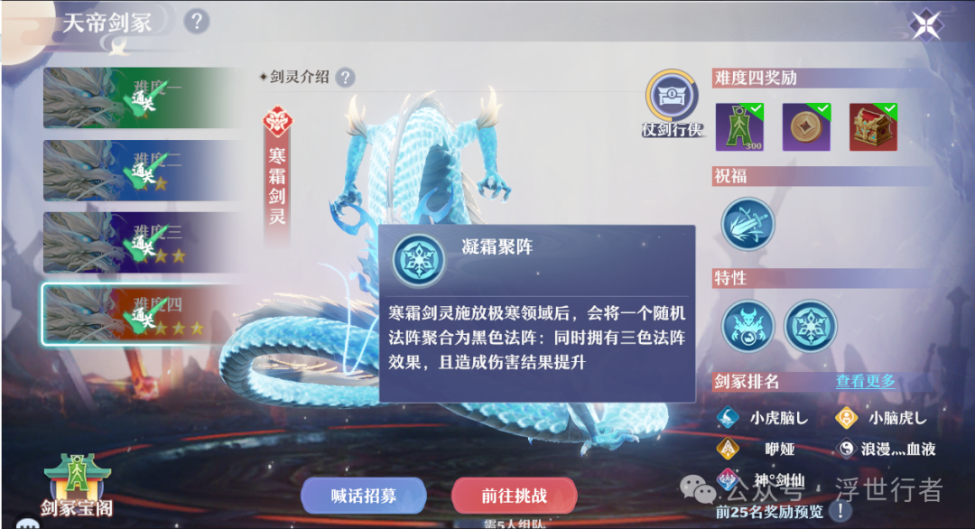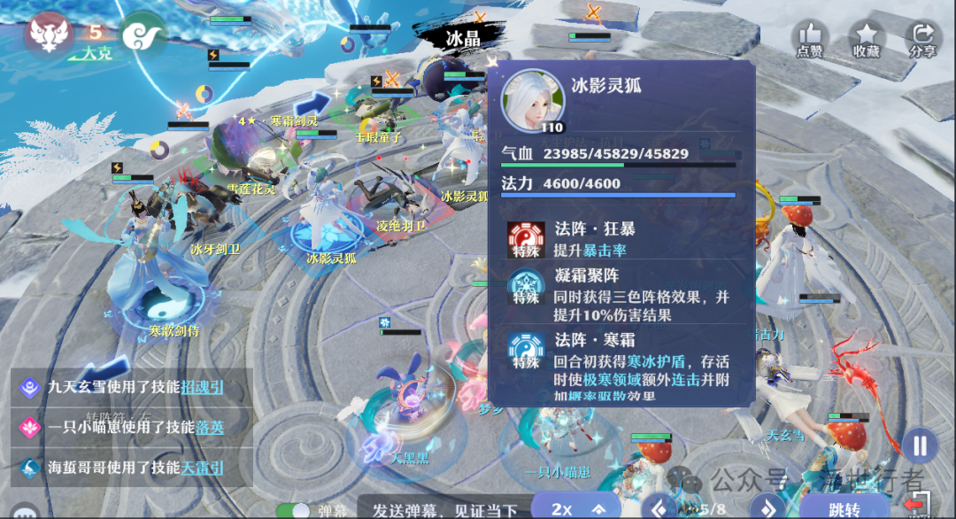词条: 凝霜聚阵:寒霜剑灵施放极寒领域后,会将一个随机法阵聚合为黑色法阵:同时拥有三色法阵效果,且造成伤害结果提升。 通关思路: 阵容推荐: 目前通关最主流的阵容还是常规双封双输出阵容(法师守尸物理集火),还有一种出场率较少的搭配是四保一阵容,法宝全部带青灵镜。 首发宝宝推荐: 首发1只暴力梦魇加4只暴力辰龙(没辰龙的话就带梦魇),全部10灵加点伤害最大化,羁绊技能带星移斗转。 角色和宝宝速度推荐: 110级:辅助门派最好不低于1650(10%速度位对应1450+),合欢速度可以稍微调快一点保证1速,物理门派尽量不要超过宝宝速度(有需要的话可以更换千速),法术门派尽量保证在570-580之间,千速1850以上。 阵法推荐: 使用云垂阵进场。 常规阵容: 第一回合: 合欢长生分别封左右两边的剑卫,奶妈喝酒或者加buff,物理门派二刀、三刀或五刀,加全部宝宝集火后边的玉瑕童子,法师点左边阵符群秒,青云的话可以天雷引。 第二回合: 合欢和长生封两个前排输出,奶妈无懈或者加血,物理打坐,天道的话继续刺苍穹,法师点后边玉瑕童子守尸,青云天雷引,其他门派可以单秒,安排1个兔子打左边阵符,其余宝宝全部集火后边雪莲花灵。如果第一回合没秒掉玉瑕童子的话,可以根据剩余气血安排单位去补。 第三回合: 封印门派根据战况选择补充封印、特技或者召唤,奶妈无懈或者加血,物理追风斩或者三刀五刀,天道继续刺苍穹,加输出宝宝收尾后边的雪莲花灵,溢出的伤害可以点前排的羽卫或者左边的鬼王,法师继续点后边玉瑕童子守尸。 第四回合: 封印门派根据战况选择补充封印、特技、方寸(优先左边南疆剑侍)、牵链子或者召唤,奶妈加血或者特技,物理加全部宝宝集火前排的羽卫,法师点后边的花灵守尸。 第五回合: 封印门派根据战况选择补充封印、特技、方寸、牵链子或者召唤,奶妈加血或者特技,安排1个兔子打右边阵符,其余宝宝收尾羽卫后开始集火两边的剑卫,法师继续守尸。 之后的回合就需要根据战况来决定,保证至少有千速在场增加容错,依次集火后边玉瑕童子,雪莲花灵,前排羽卫,两边剑卫和其他单位,最后再集火boss,法师稳定守尸即可。 注意事项: 1、第一回合注意召唤魅灵,优先月灵羽灵可以提高容错,PVE玩法并没有入场冷却。 2、前期没控制住南疆的时候法师可以单秒守尸,防止守不住尸体猝死,等到控制对面南疆后再群秒守花妖,带青云的话不用封奶,一直使用天雷引守花妖即可。 3、第1回合法师群秒左边阵符,第2回合梦魇(优先哮天犬坐骑)补左边阵符,第5回合梦魇补右边阵符,第8回合梦魇补左边阵符...只要保证369...回合清理掉蓝色和黑色法阵的目标别让boss大招连击即可。 4、辅助稳定续上无懈,如果感觉可能续不上可以提前喝酒,没有无懈的话boss的爆发伤害很难顶。 5、及时出千速增加容错,可以在物理门派调息或者其他门派掉宝宝的时候出,后期可以换成输出宝宝加快速度。 更多游戏攻略,请锁定叶子猪《梦幻新诛仙》官方合作专区。 编辑:叶子猪小秘书