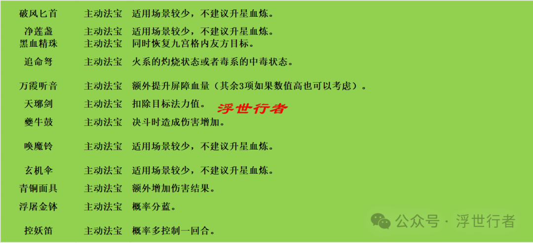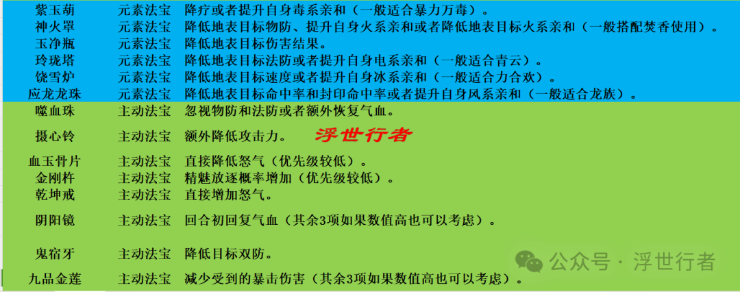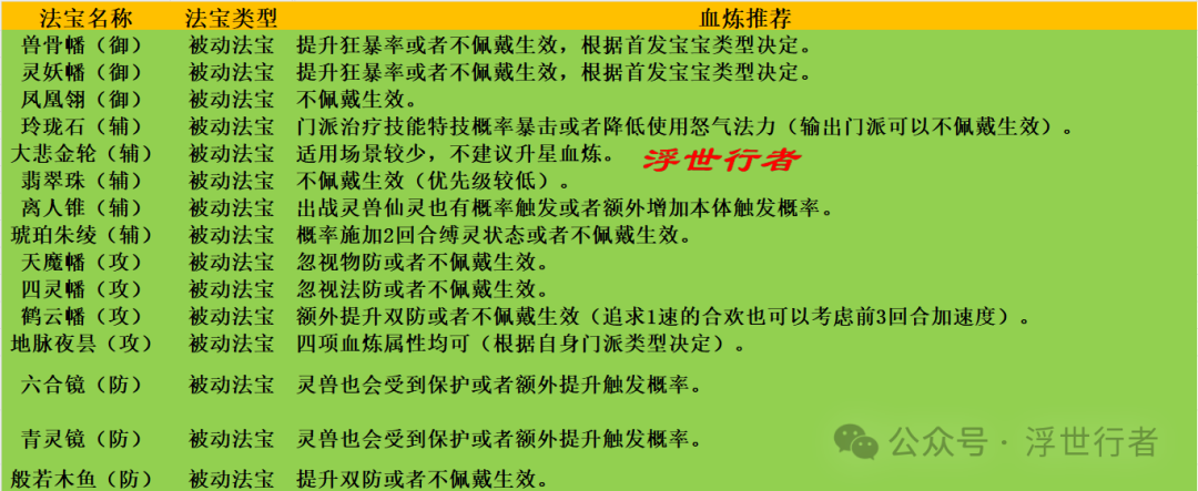 作者:浮世行者 被动法宝: 兽骨幡(御):提升狂暴率或者不佩戴生效,根据首发宝宝类型决定。 灵妖幡(御):提升狂暴率或者不佩戴生效,根据首发宝宝类型决定。 凤凰翎(御):不佩戴生效。 玲珑石(辅):门派治疗技能特技概率暴击或者降低使用怒气法力(输出门派可以不佩戴生效)。 大悲金轮(辅):适用场景较少,不建议升星血炼。 翡翠珠(辅):不佩戴生效(优先级较低)。 离人锥(辅):出战灵兽仙灵也有概率触发或者额外增加本体触发概率。 琥珀朱绫(辅):概率施加2回合缚灵状态或者不佩戴生效。 天魔幡(攻):忽视物防或者不佩戴生效。 四灵幡(攻):忽视法防或者不佩戴生效。 鹤云幡(攻):额外提升双防或者不佩戴生效(追求1速的合欢也可以考虑前3回合加速度)。 地脉夜昙(攻):四项血炼属性均可(根据自身门派类型决定)。 六合镜(防):灵兽也会受到保护或者额外提升触发概率。 青灵镜(防):灵兽也会受到保护或者额外提升触发概率。 般若木鱼(防):提升双防或者不佩戴生效。 元素法宝: 紫玉葫:降疗或者提升自身毒系亲和(一般适合暴力万毒)。 神火罩:降低地表目标物防、提升自身火系亲和或者降低地表目标火系亲和(一般搭配焚香使用)。 玉净瓶:降低地表目标伤害结果。 玲珑塔:降低地表目标法防或者提升自身电系亲和(一般适合青云)。 饶雪炉:降低地表目标速度或者提升自身冰系亲和(一般适合力合欢)。 应龙龙珠:降低地表目标命中率和封印命中率或者提升自身风系亲和(一般适合龙族)。 主动法宝: 噬血珠:忽视物防和法防或者额外恢复气血。 摄心铃:额外降低攻击力。 血玉骨片:直接降低怒气(优先级较低)。 金刚杵:精魅放逐概率增加(优先级较低)。 乾坤戒:直接增加怒气。 阴阳镜:回合初回复气血(其余3项如果数值高也可以考虑)。 鬼宿牙:降低目标双防。 九品金莲:减少受到的暴击伤害(其余3项如果数值高也可以考虑)。 破风匕首:适用场景较少,不建议升星血炼。 净莲盏:适用场景较少,不建议升星血炼。 黑血精珠:同时恢复九宫格内友方目标。 追命弩:火系的灼烧状态或者毒系的中毒状态。 万霞听音:额外提升屏障血量(其余3项如果数值高也可以考虑)。 天琊剑:扣除目标法力值。 夔牛鼓:决斗时造成伤害增加。 唤魔铃:适用场景较少,不建议升星血炼。 玄机伞:适用场景较少,不建议升星血炼。 青铜面具:额外增加伤害结果。 浮屠金钵:概率分蓝。 控妖笛:概率多控制一回合。 血炼保底机制: 每种血炼属性的保底次数是25次(血炼时会轮流依次产出四种血炼属性,可以游戏界面设置-客服中心-法宝血炼查询当前各项属性保底次数)。每个法宝保底血炼出需求属性的话大概需要97-100次血炼,也就是970-1000个对应法宝精华。 以上就是本期全部内容,更多游戏攻略,请锁定叶子猪《梦幻新诛仙》官方合作专区。 编辑:叶子猪小秘书